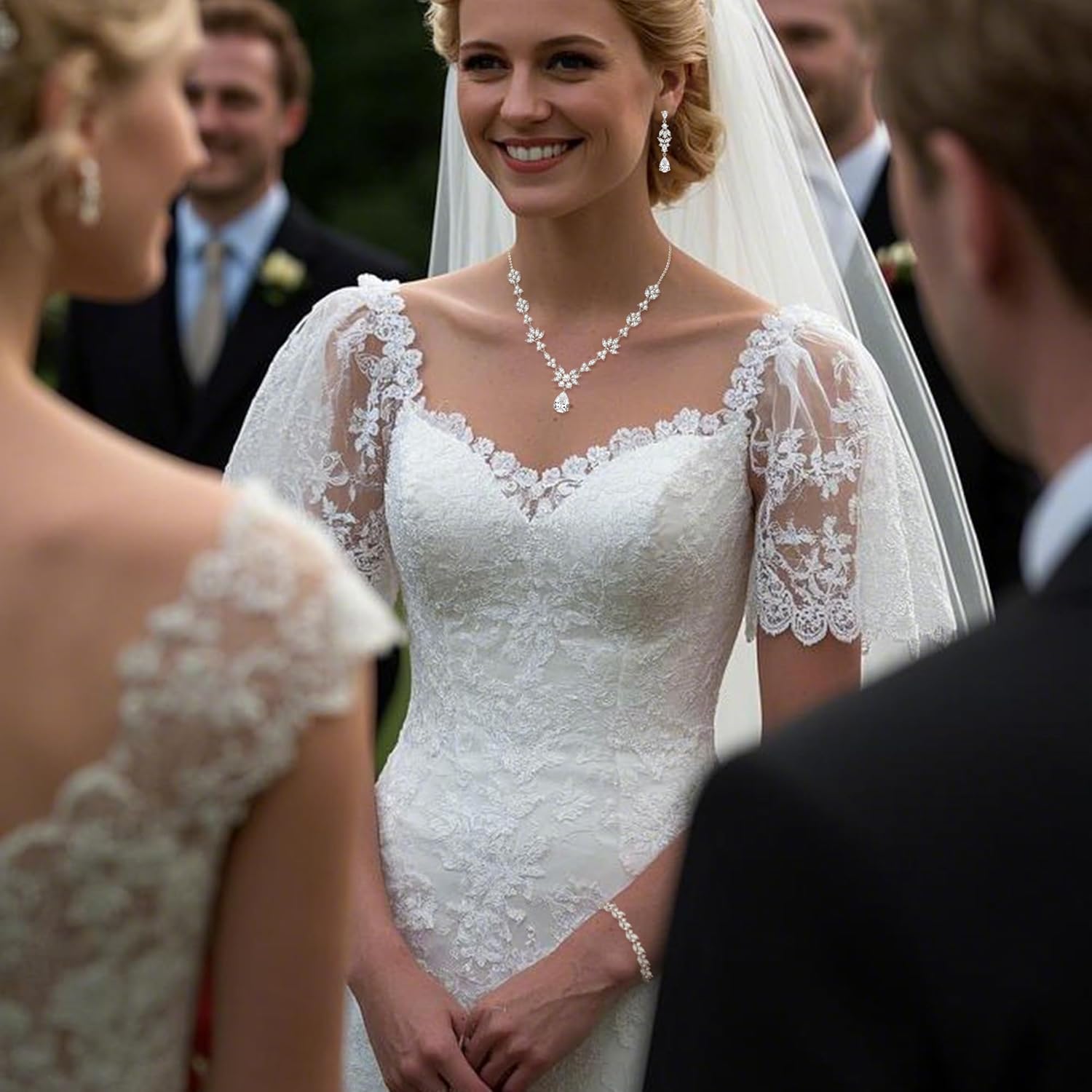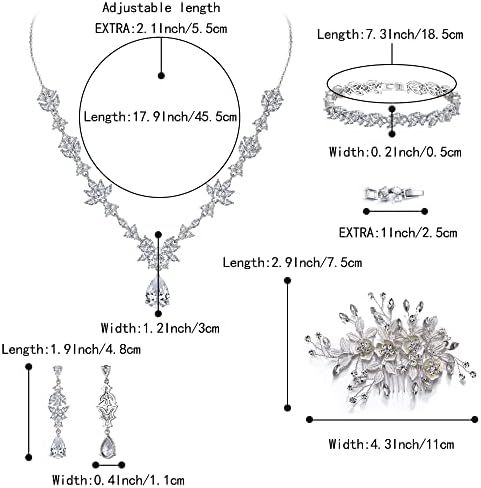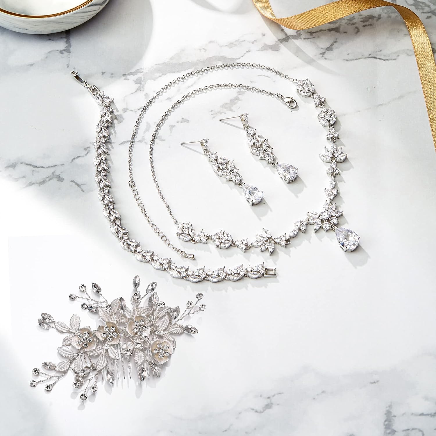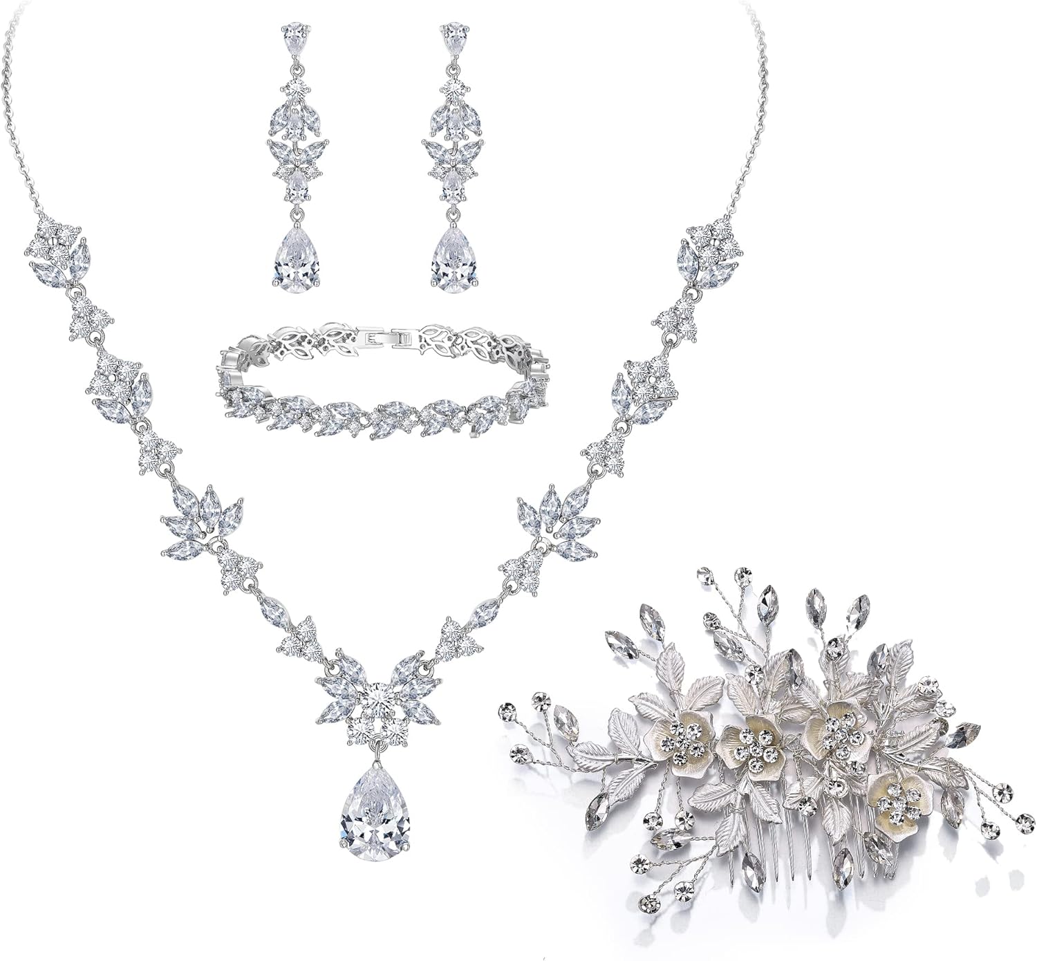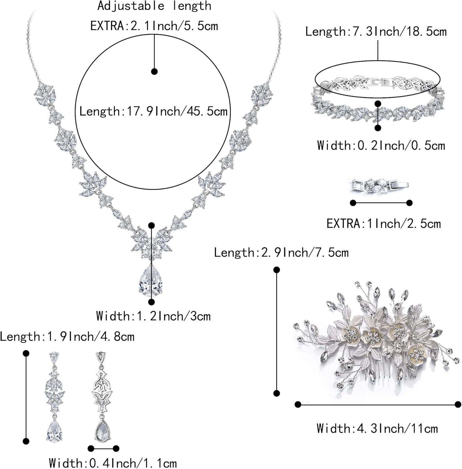 - Material:Bridal jewelry set for wedding.Sparkling necklace and earrings bracelet set.With a fabulous design and solid construction.The classic and elegant always keep pace with fashion,which will make a timeless accessory to any jewelry collection. Can be worn with classy casual with formal attire or Wedding dress.Adorned with Hearts and Arrows Cut Cubic Zirconia, crafted with eco-friendly brass, this special design is born to match the clothes and your unique beauty.