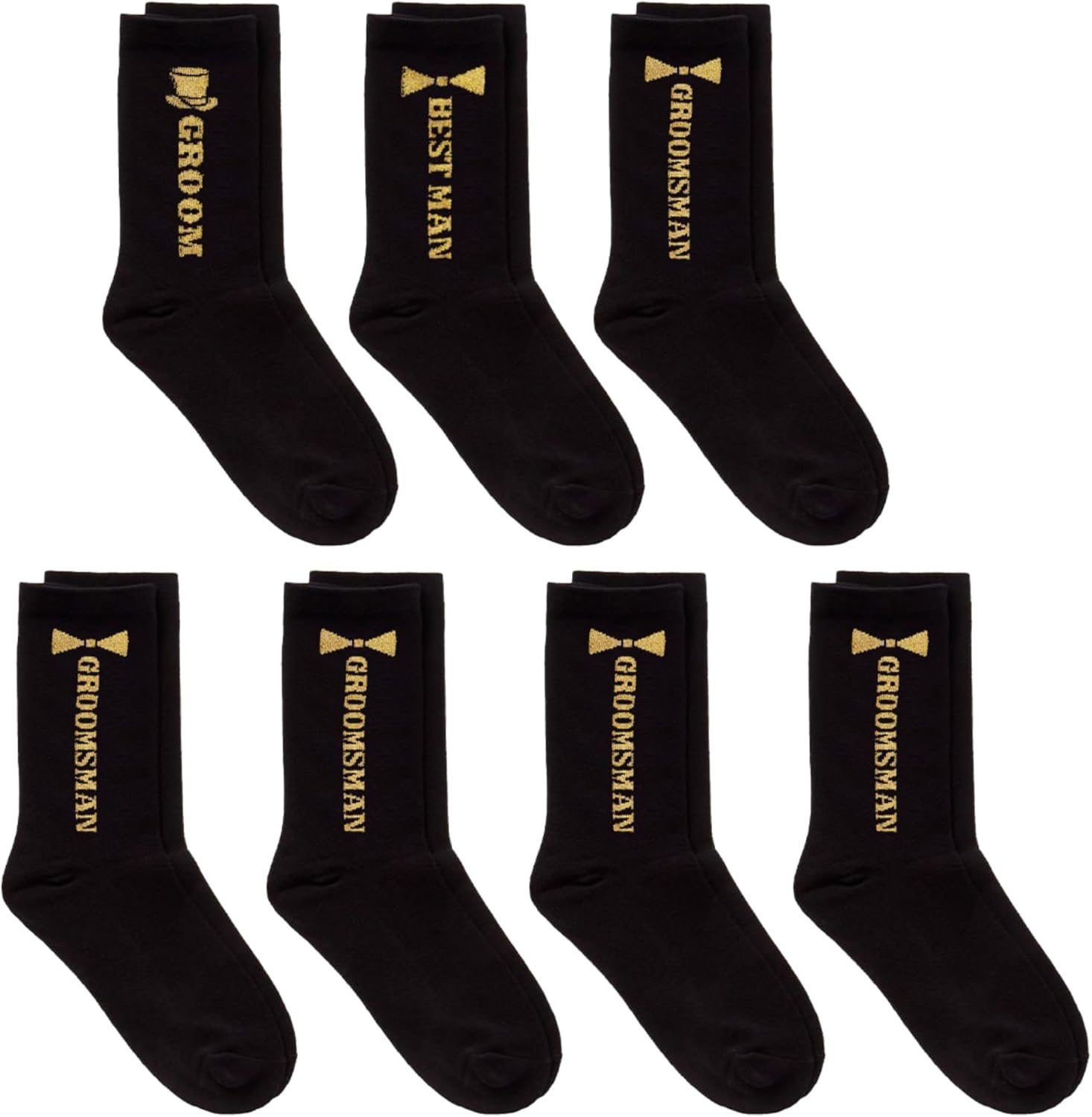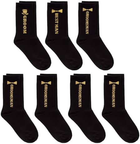 - ✔️ Full Wedding Party Set – Includes 7 pairs of black socks with gold embroidery. 1 “Groom,” 1 “Best Man,” and 5 “Groomsmen.” Everyone’s covered—literally—for the big day. Made from soft, breathable materials that your crew can wear from the morning prep to the last dance and beyond.
