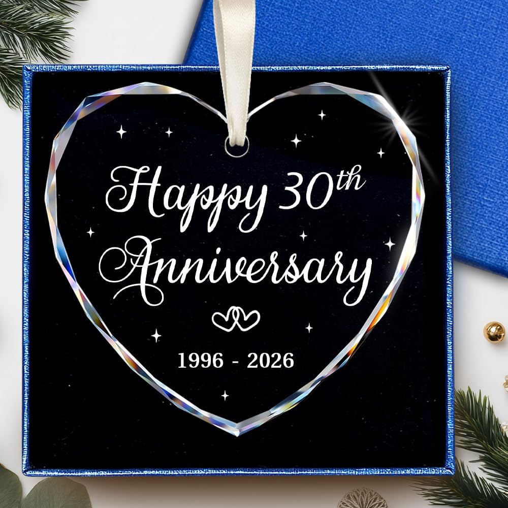 - Happy 30th Anniversary: This heart-shaped glass ornament is a sweet way to celebrate thirty years together. A small keepsake that reminds a couple of the love and memories built over 30 years.