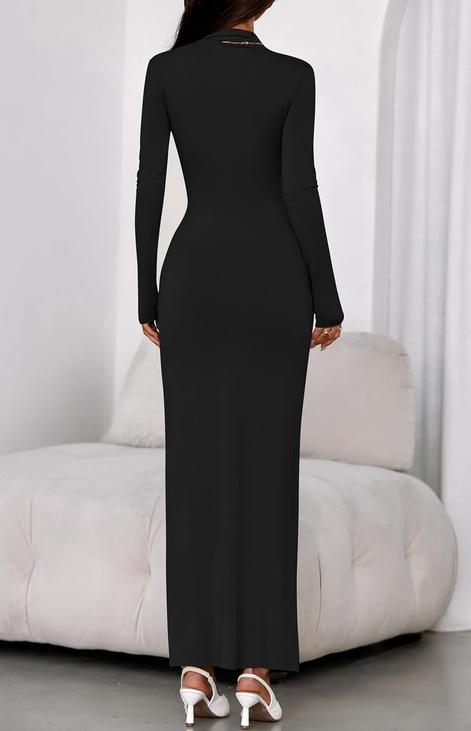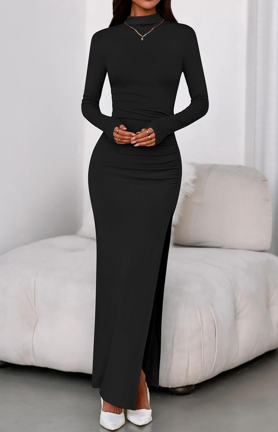 - FEATURES: Long Sleeve Dress For Women / High Neck Bodycon Dress / Ruched Dresses For Women / Tight Fitted Dresses / Side Slit Maxi Dress / Solid Color / Fits For Spring, Summer, Fall, Winter