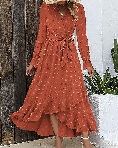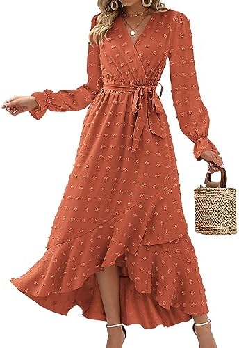 - DESIGNS: Feminine Wrap V Neck Is The Highlight Of The Womens Dresses, Greatly Emphasizes Your Charming Clavicle. High Waist Combine With A Self Tie Belt, Creates An A-Line Shape. The High-Low Split Hem Gives The Fall Dresses A Playful Touch