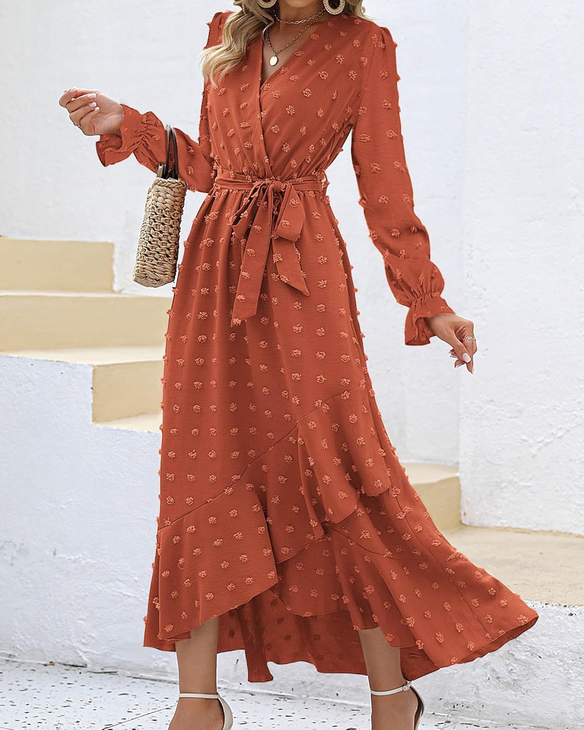 - FEATURES: Wrap V Neck Dresses, A Line Dresses For Women, Sleeve End With Ruffle Cuffs, Neck End With Safety Snap, Self Tie Belt, Pleated Wrap Hem, 3D Swiss Dot, Fits For Spring, Summer, Fall