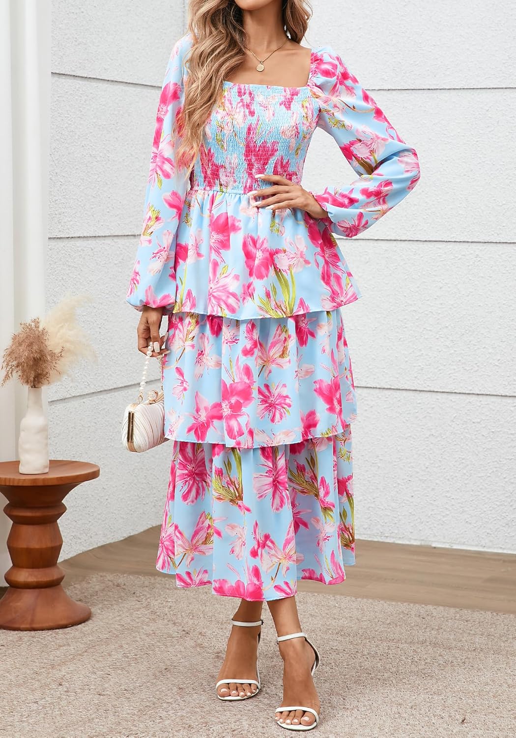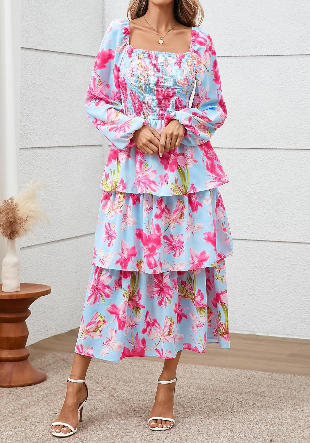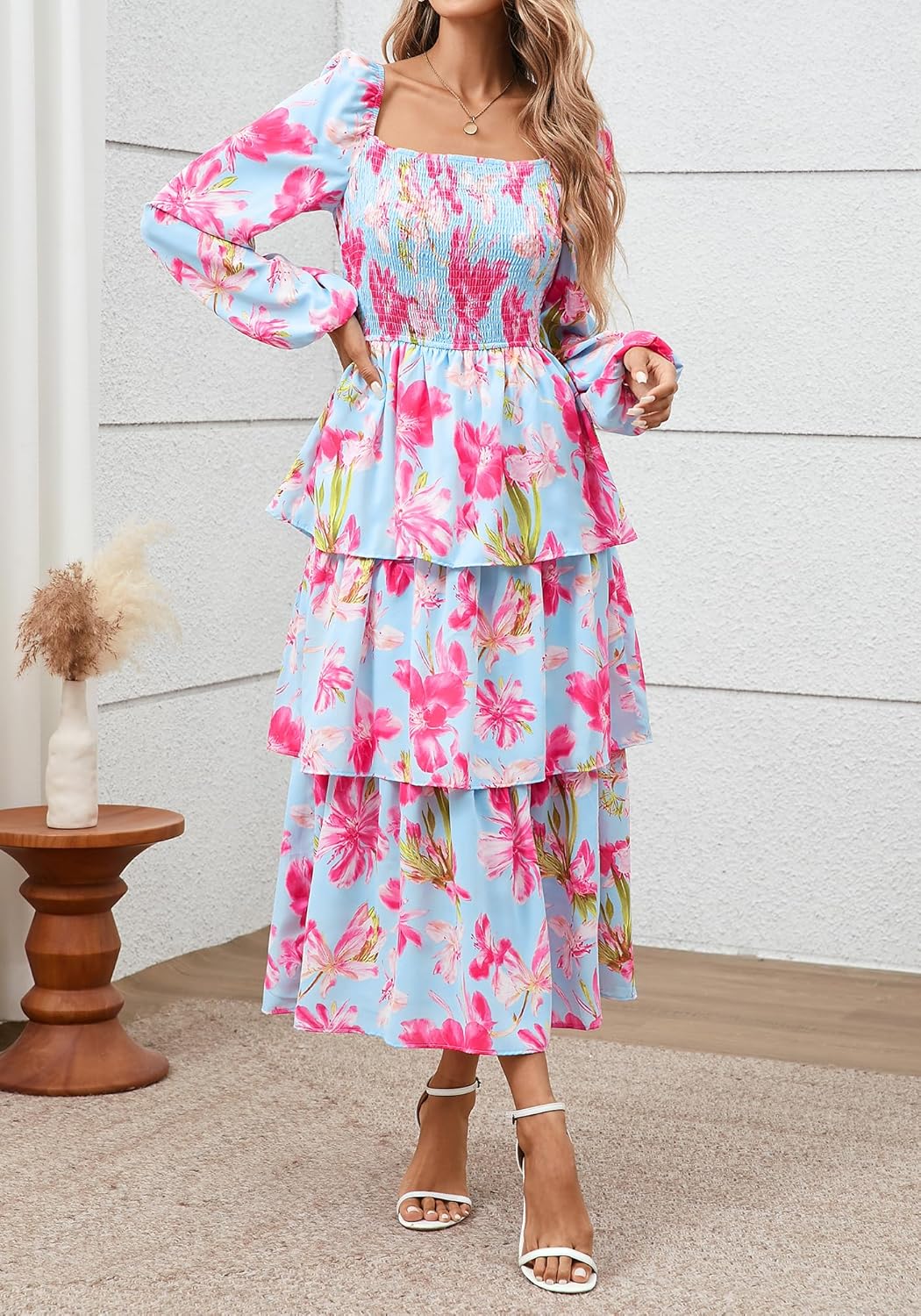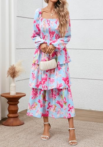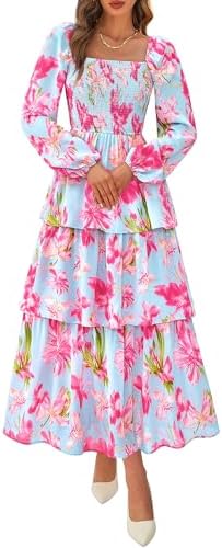 - FEATURES: S=US 4-6, M=US 8-10, L=US 12-14, XL=US 16-18, XXL=US 20 / Maxi Dress / Square Neck Dress / Long Sleeve Dress / Floral Dress / Ruffle Dress / Tiered Dress Women / Smocked Dress Women / a-Line Dress / Lightweight / Comfy To Wear / For Spring, Summer, Fall