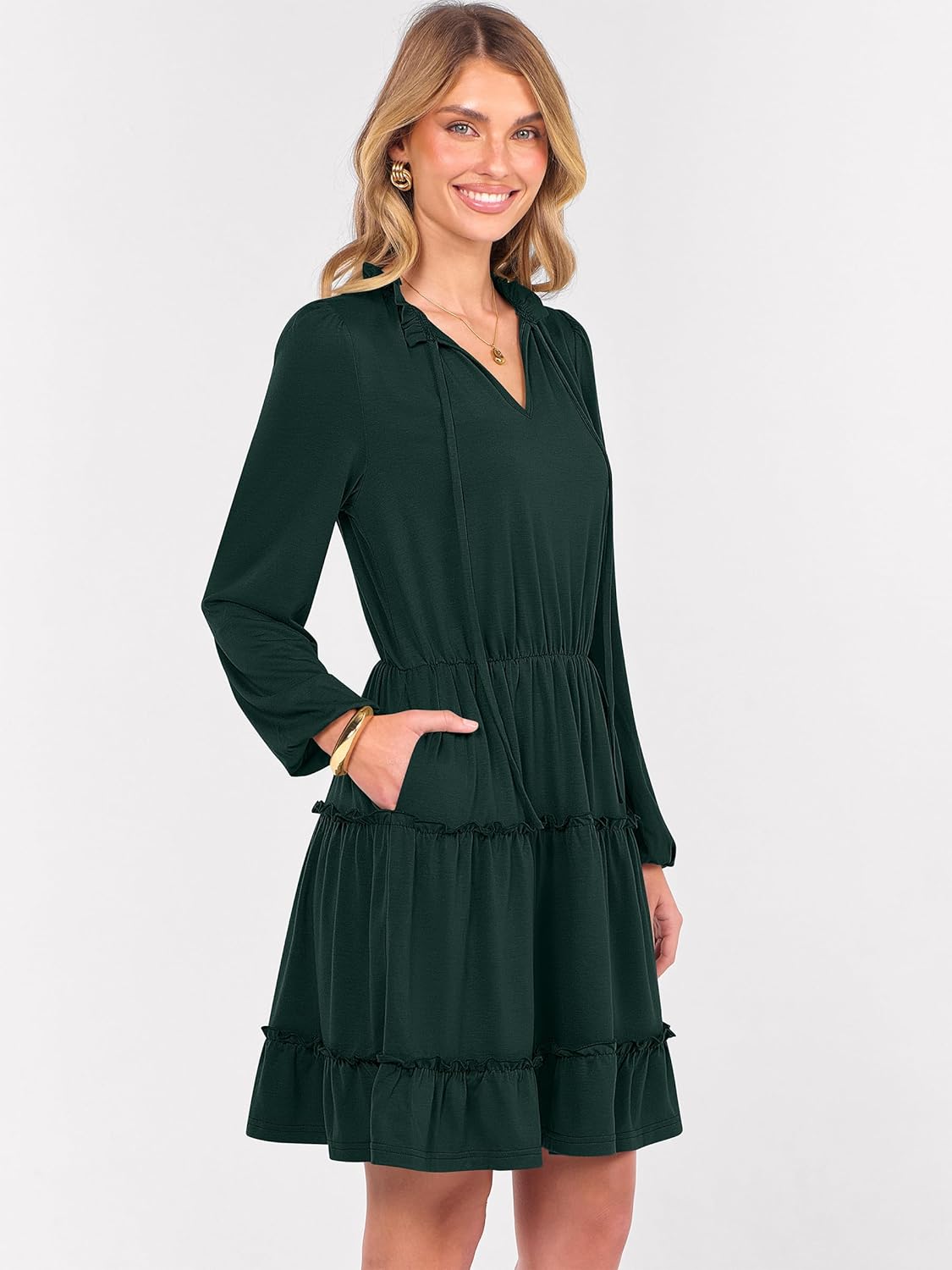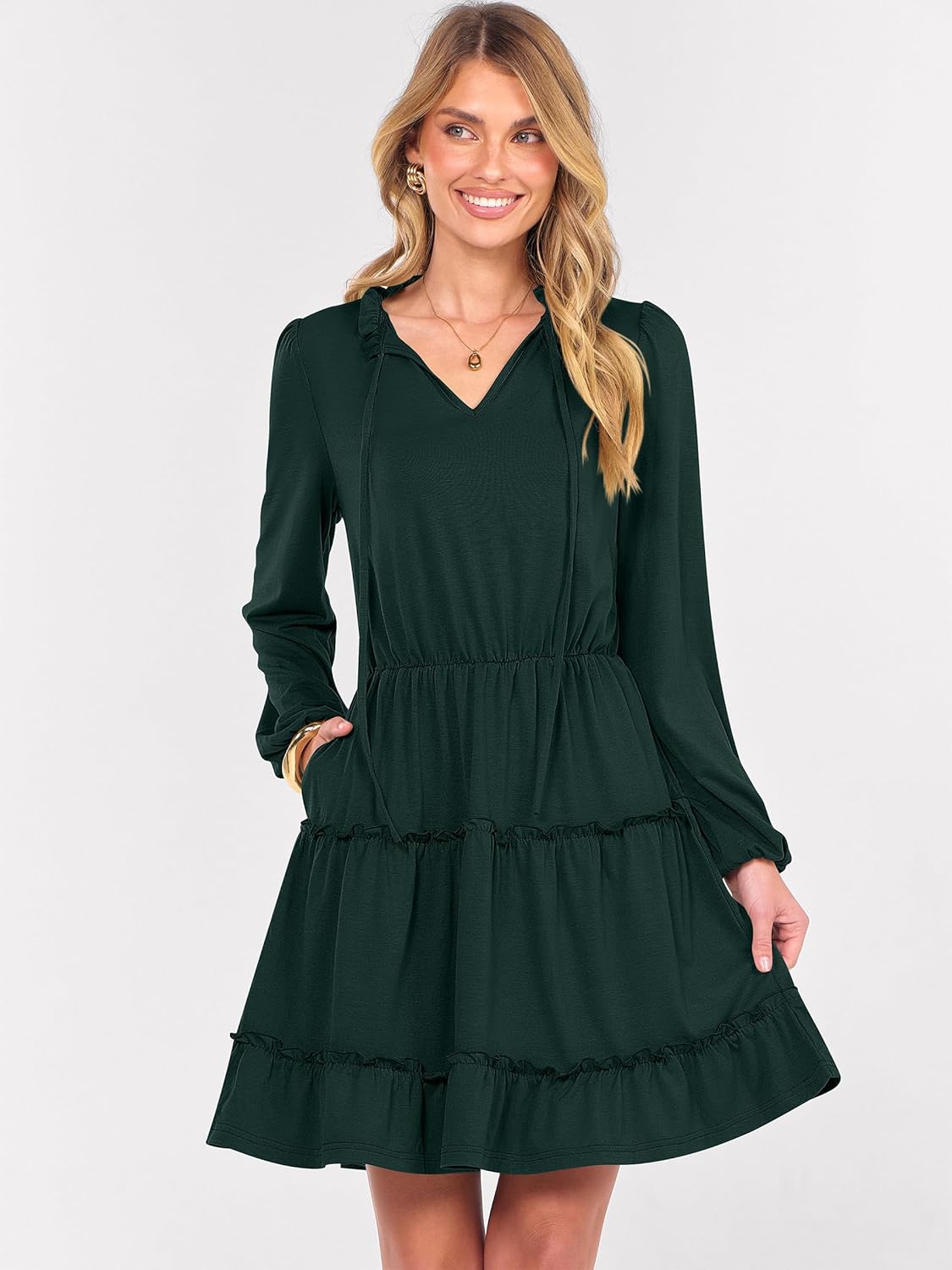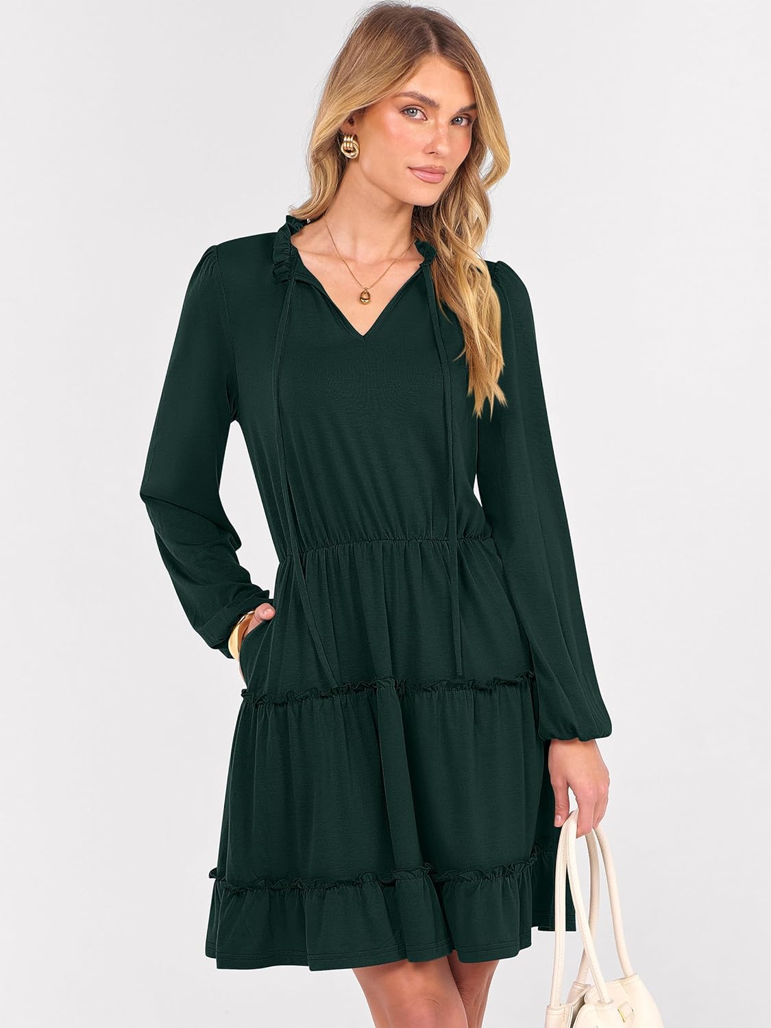 • Design – Cute and classy style featuring a tie V-neck collar, long sleeves with elastic cuffs, an elastic high waist, mini length, ruffled tiers, side pockets, and a swing A-line silhouette. This fashionable short dress is perfect for creating an elegant look!