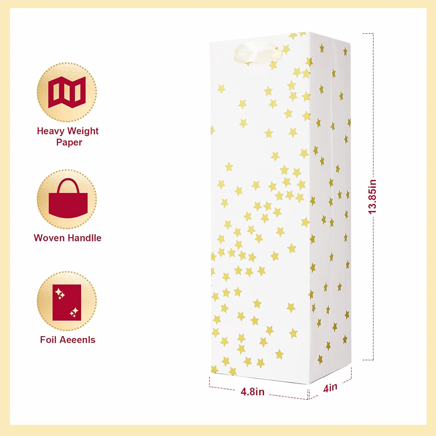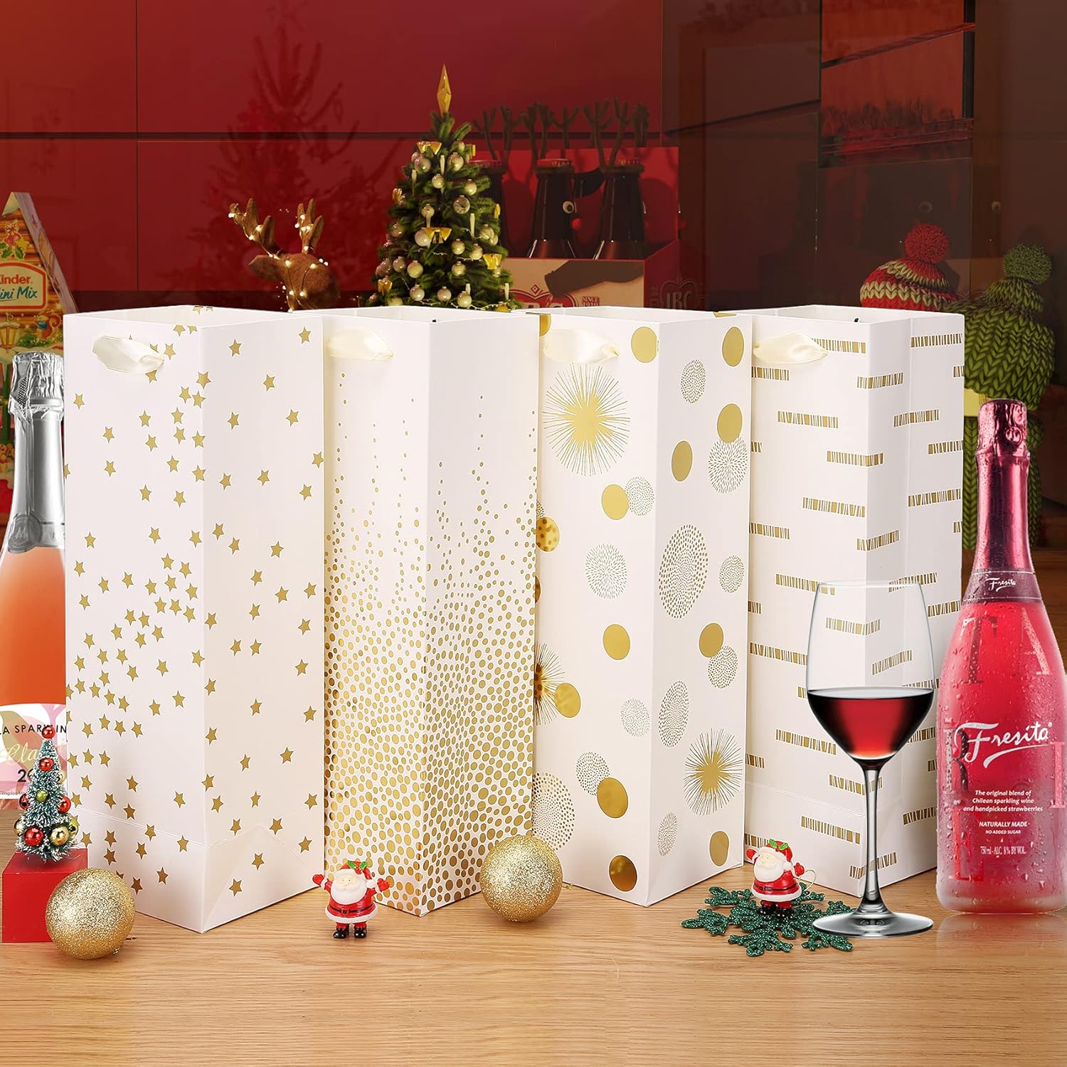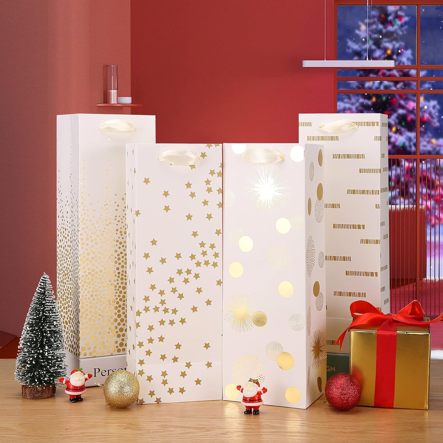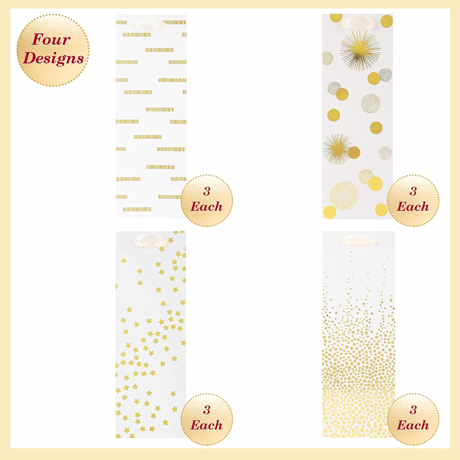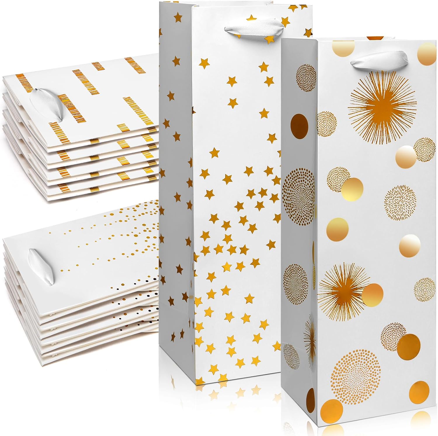 - [Ideal Wine Gift Bags Size] This set of 12 wine bags is designed with metallic gold foil imprinting on both sides, featuring delightful 4 assorted patterns. The dimensions of wine gift bag are roughly 6.14 inches wide by 14.45 inches high by 2.76 inches deep.