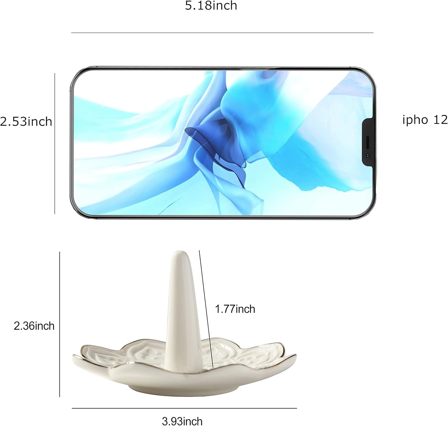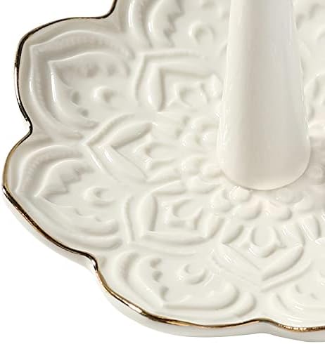 - A decorative ring holder crafted from white ceramic with hand-painted golden edge lines, perfect as beautiful home décor for nightstands or bathrooms.