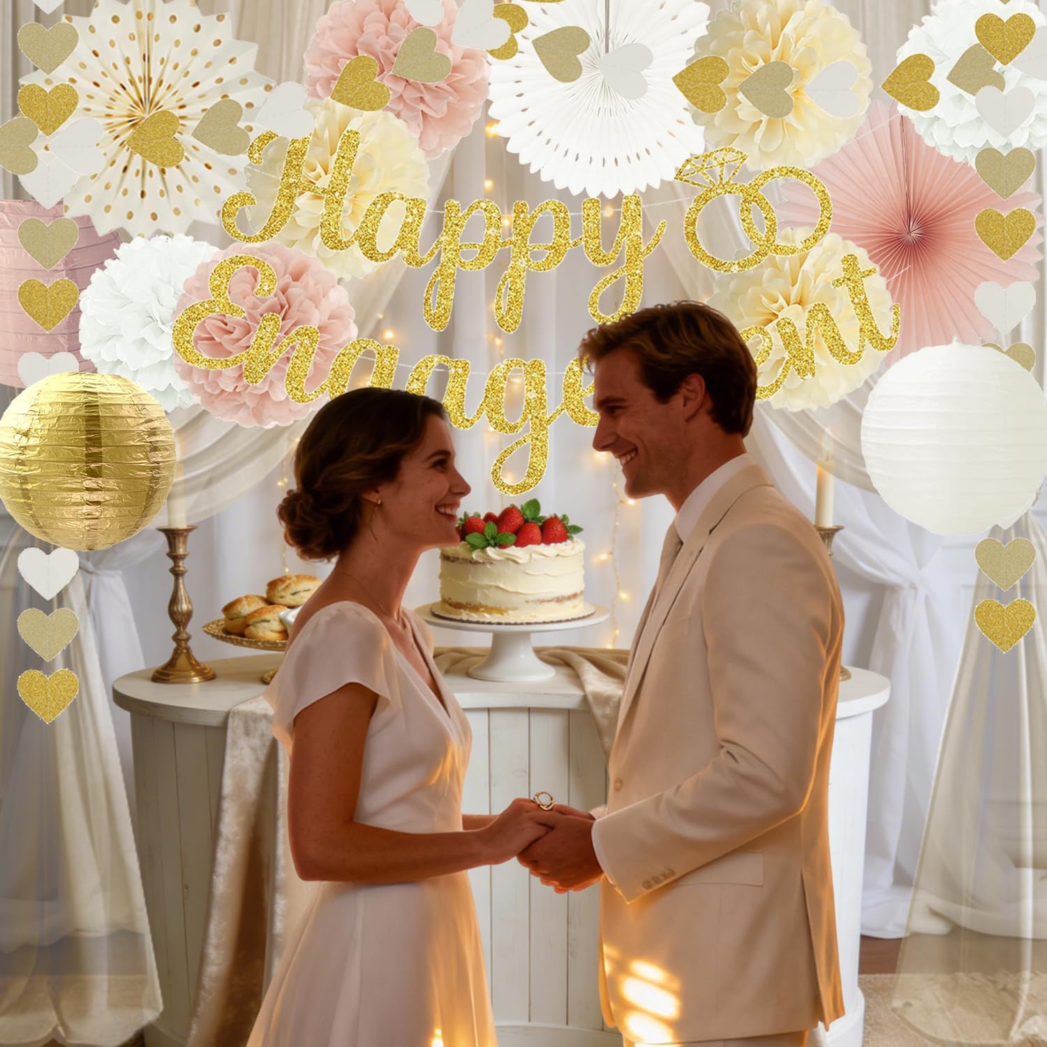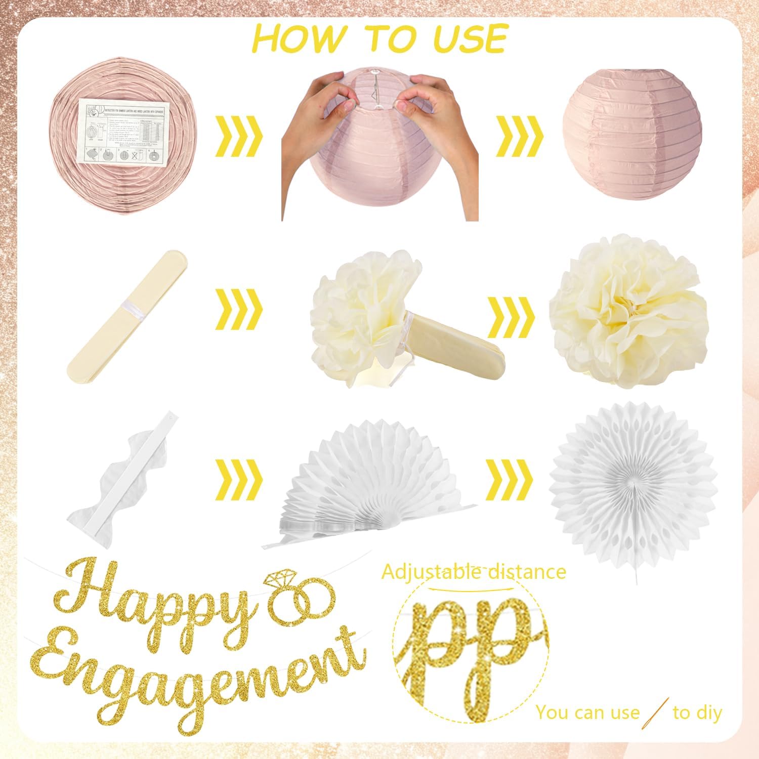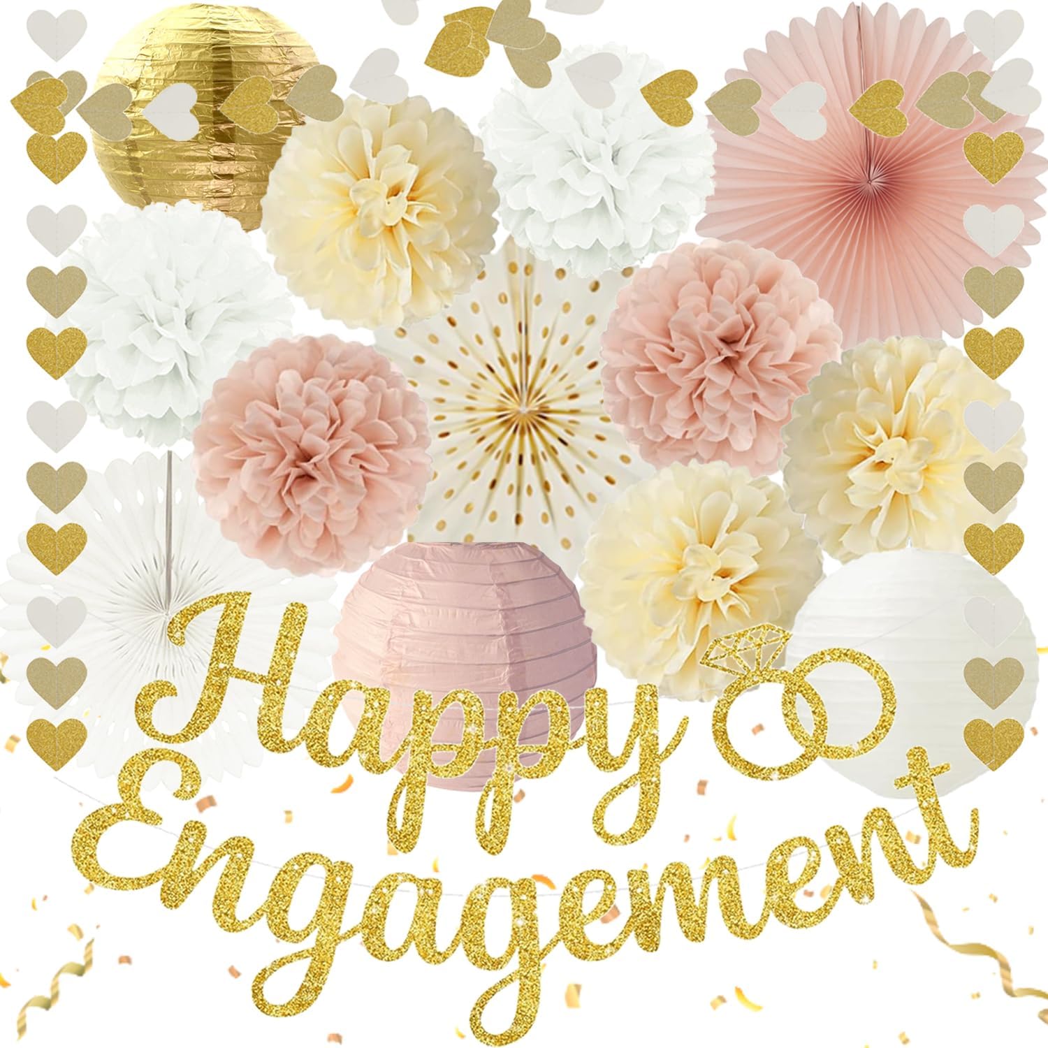 - 【Value Pack】This engagement decorations set includes a happy engagement banner, a heart streamers garland, 7pcs 8″ paper pom poms, 3pcs 12″ paper fans, and 3pcs 8″ paper lanterns. Enough quantity of decorations to meet your decoration needs