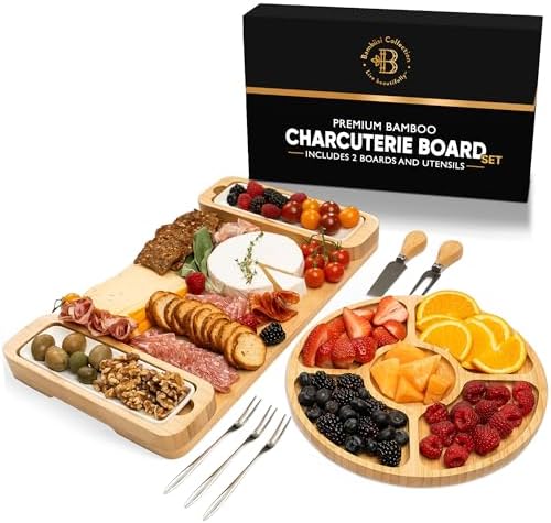 - HIGH-QUALITY BAMBOO DESIGN: Made from premium, eco-friendly bamboo, this charcuterie board set is durable, stain- and odor-resistant, and easy to clean. The polished finish highlights the natural bamboo beauty, adding a sophisticated touch to any table.
