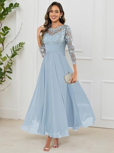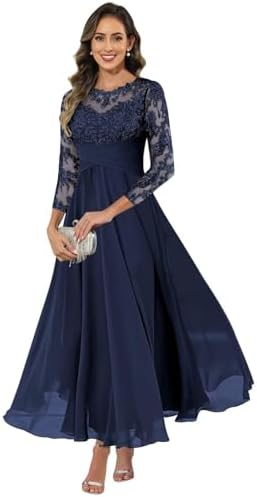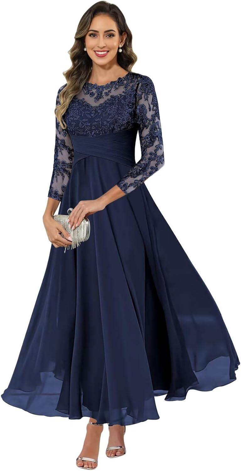 - Feature Detail: Mother of The Bride Dresses for Wedding.Chiffon and lace material,A line,Scoop neck,3/4 Sleeve Sleeve,Tea length,Zipper Back,Built-in-Bra
