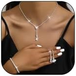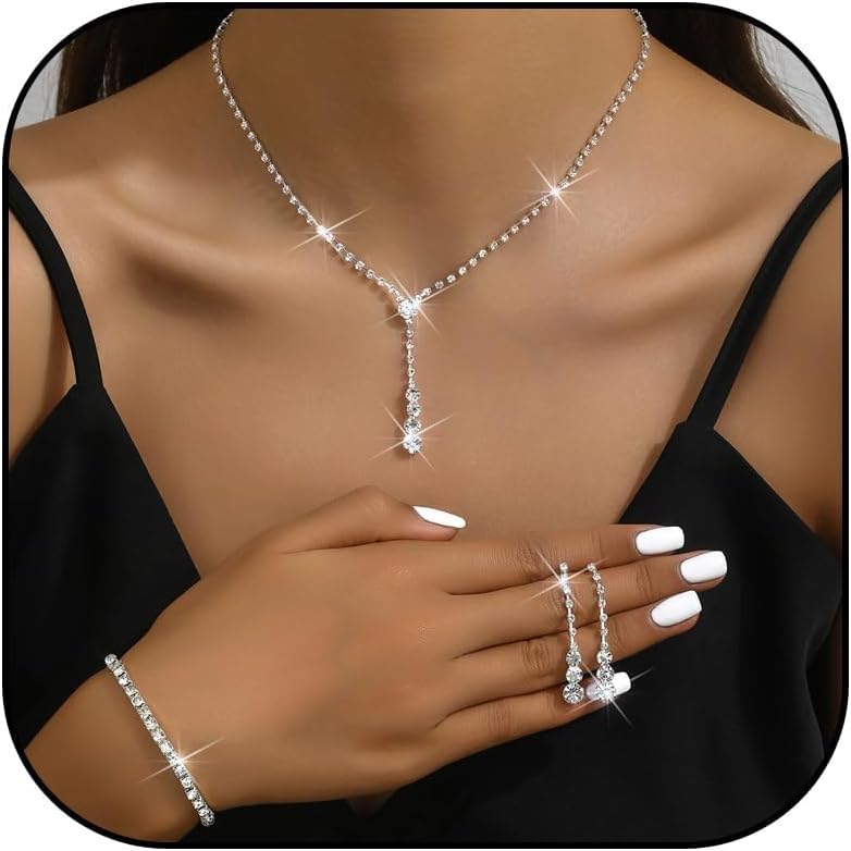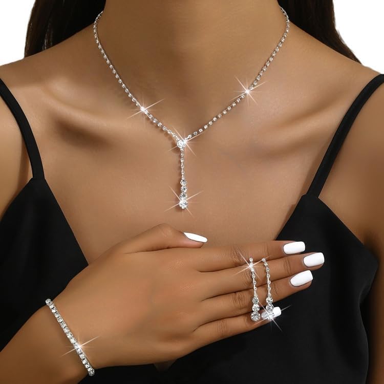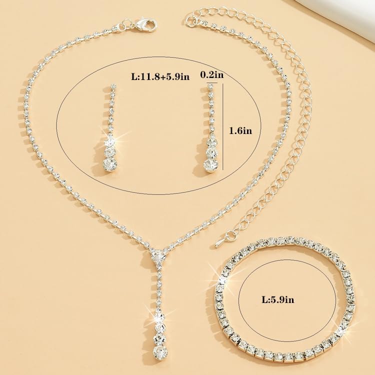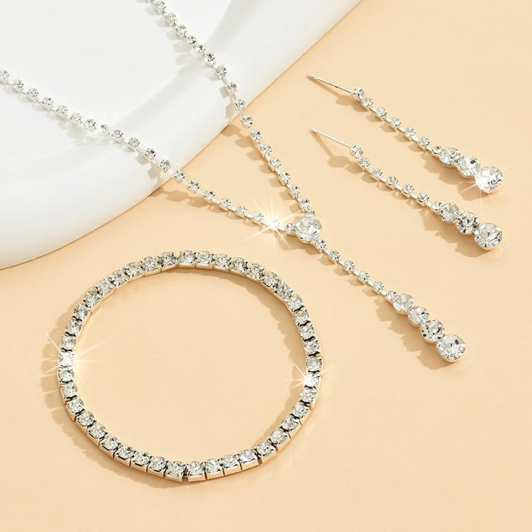 - Wedding Jewelry Sets:Sparkled wedding jewelry set includes 1 pc rhinestone necklace, 1 pc tennis bracelet, and 1 pairs dangling earrings. With a classic and elegant design, this set of silver Bridal jewelry for wedding can perfectly complement your beauty and bring you a unique wearing experience. Don’t think twice, just try it