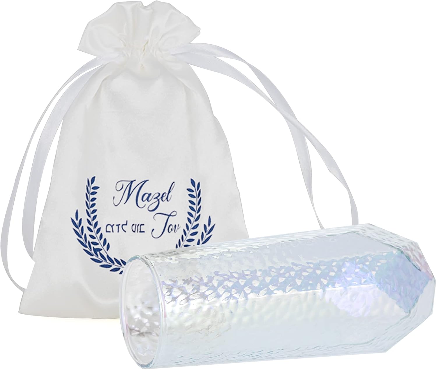 Designed to be an easy-breaking glass for a successful and joyous under-the-huppah celebratory glass foot stomp! Glass is enclosed in the included protective bag to avoid injury and to save the broken glass pieces as a memory.This uniquely shaped glass cup is designed specifically for the purpose of breaking it safely, and entirely and to create the most beautiful shards possible.The glass is thin enough to crush with a single light step. There are no thicker or thinner spots so it breaks evenly without creating any sharp and dangerous protrusions.