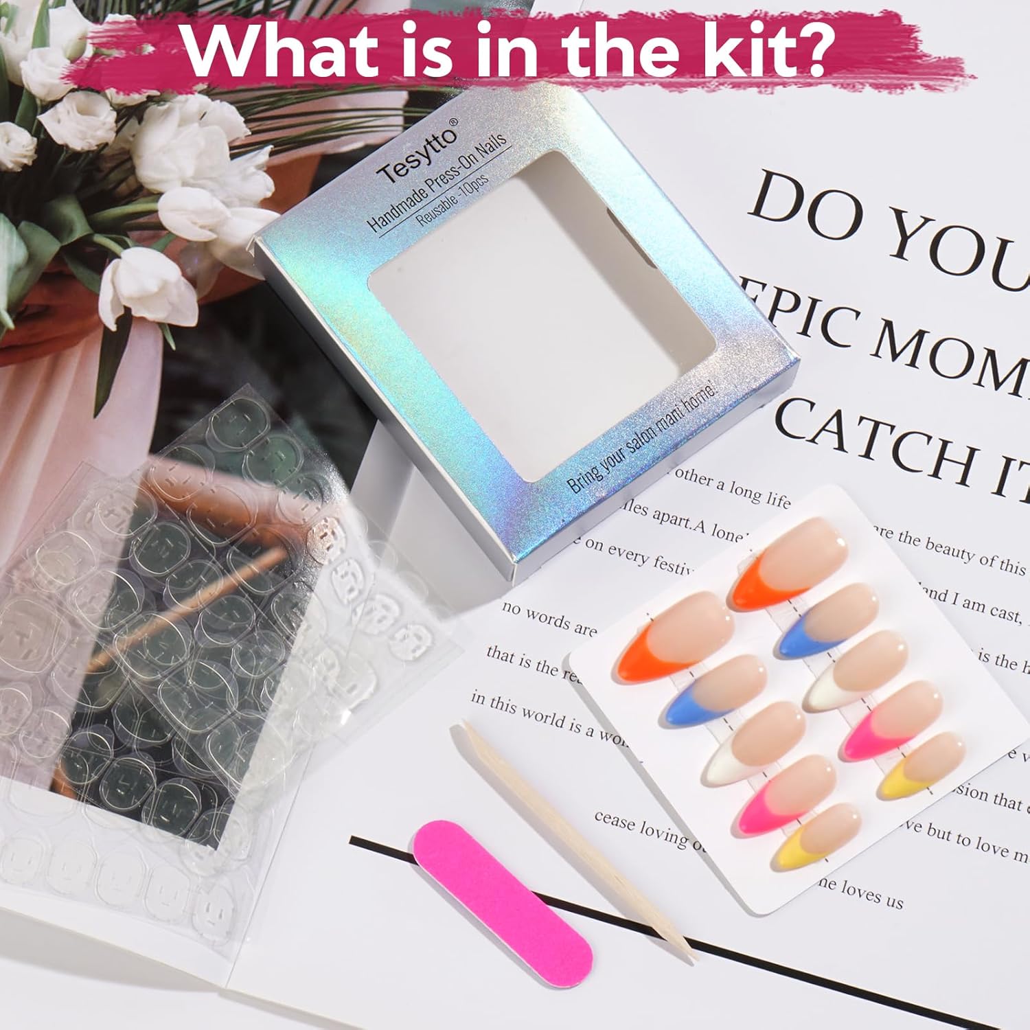 • Packaging Content: Includes 10pcs handmade press on nails (SIZE M), 3*24pcs nail tabs, a remover stick, and a nail file. For best reusability, use with recommended nail tabs.