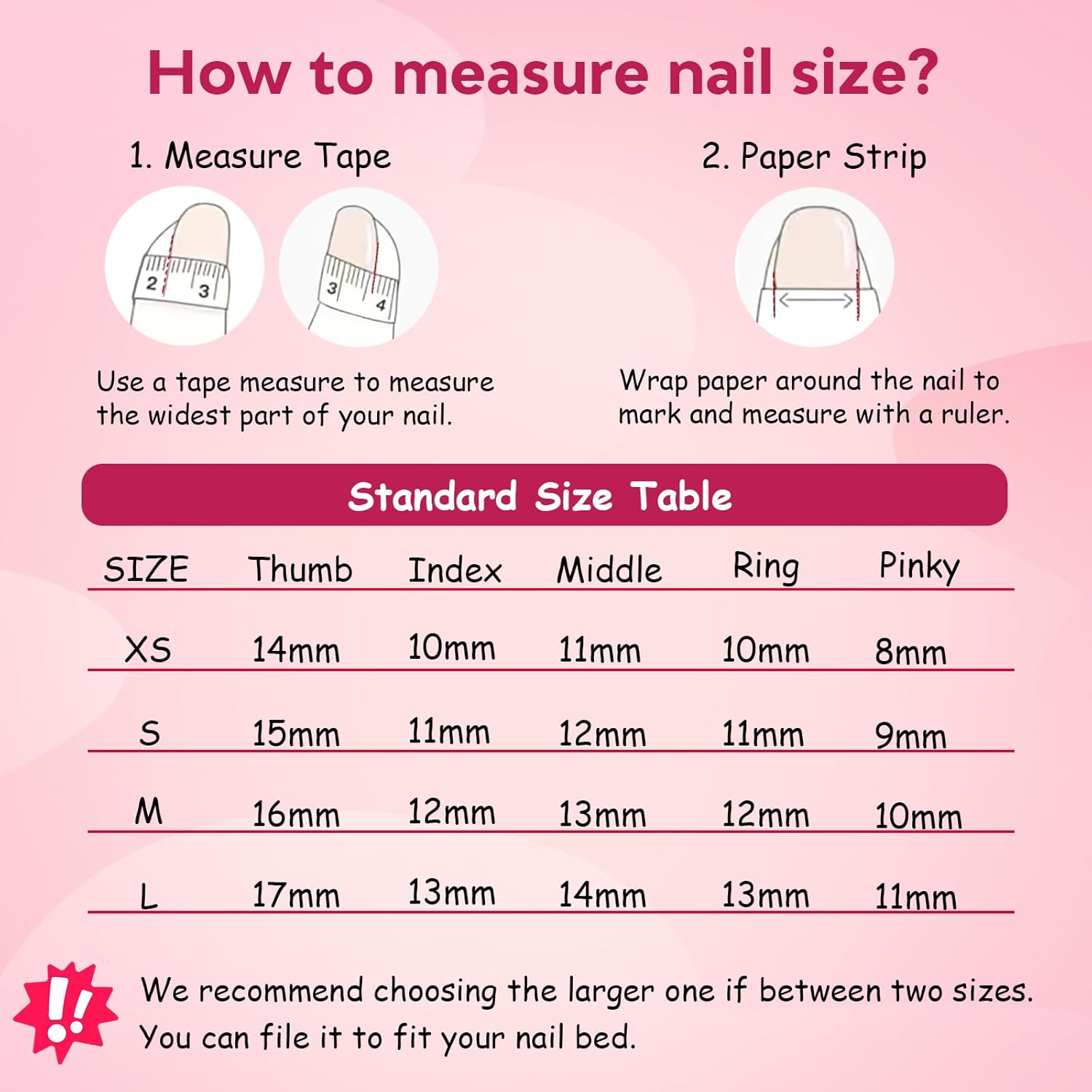 • Size Selection: Refer to the size chart in product details. Choose the size matching your nail width. If between sizes, pick the larger one for a comfortable fit.