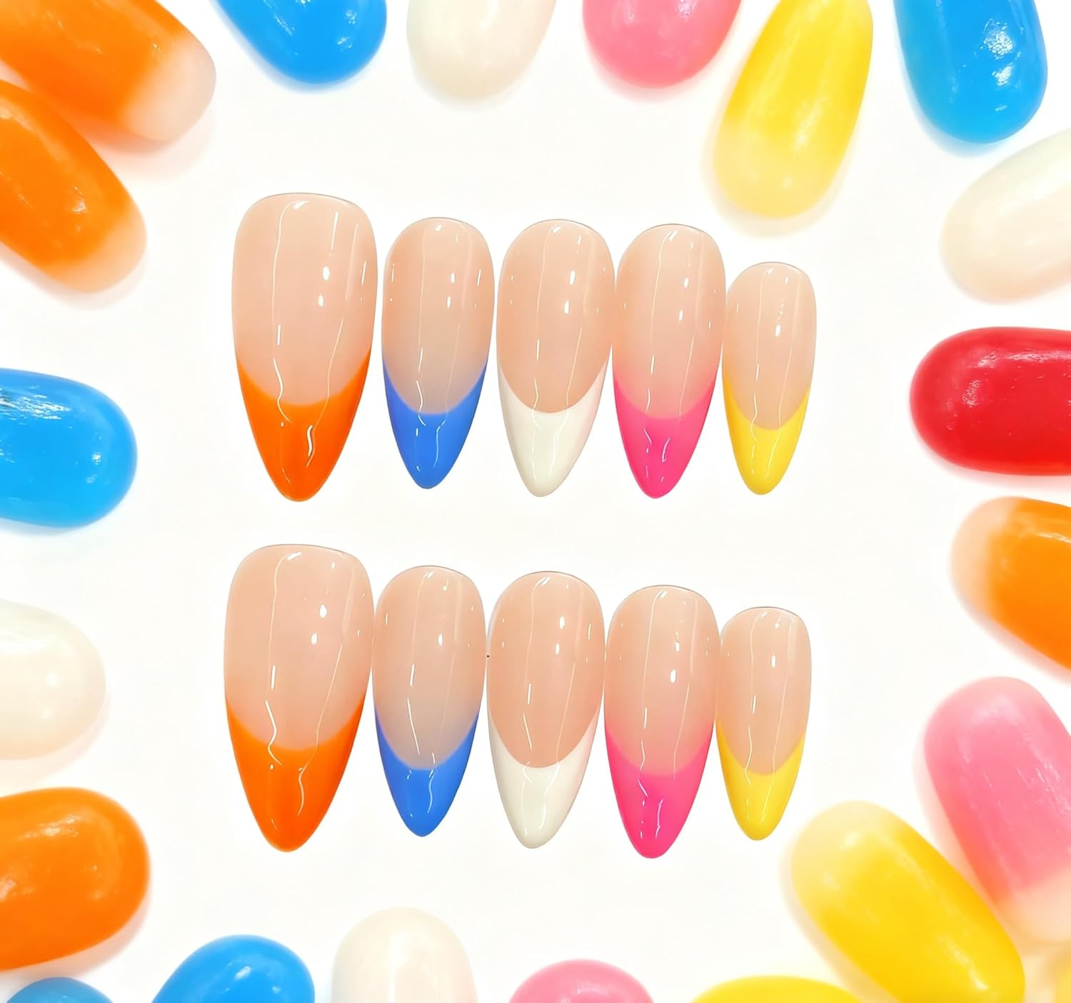 Colorful French Tip Press on Nails Medium Almond Fake Nails Nude Sheer False Nails with Designs Glossy Acrylic Stick on Nails for Women (Creamy Heart French, M)