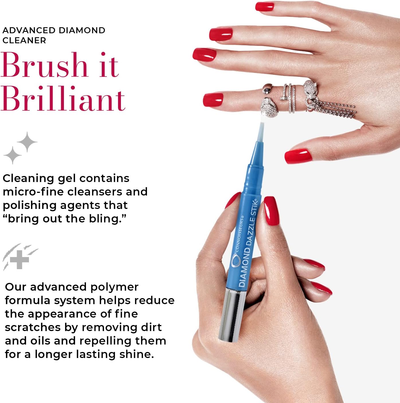 - BRUSH IT BRILLIANT: Travel-size cleaner pen keeps jewelry sparkling on the go; Brush head dispenses solution to reach between prongs and under settings; Cleaning gel contains micro-fine cleansers and polishing agents that “bring out the bling”