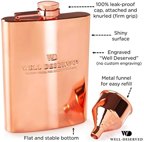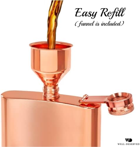 Copper Flask for Liquor for Men: 8oz Flask + Funnel + Pouch + Deluxe Gift Box Set. Copper Gifts for 7th Anniversary for Him. Mens Hip Flask. Engraved WellDeserved