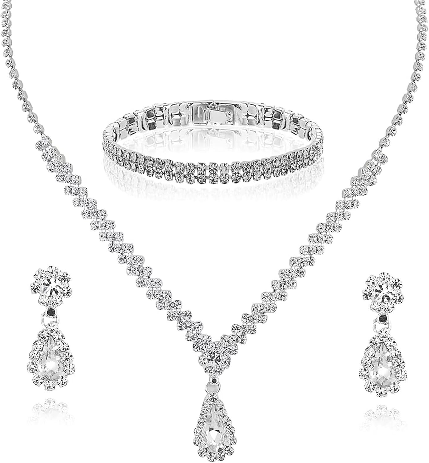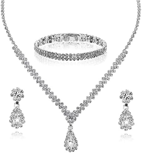 - [Package Contents] The package you received is a shiny and elegant wedding jewelry set, which contains a bright necklace, a pair of pendant earrings and a shiny bracelet.3 types jewelry of wedding, Inlaid with rhinestones and crystal , beautiful and sparkling. The elegant and fashionable jewelry sets can be used as bridal wedding jewelry, bridesmaid’s wedding jewelry, prom jewelry, etc