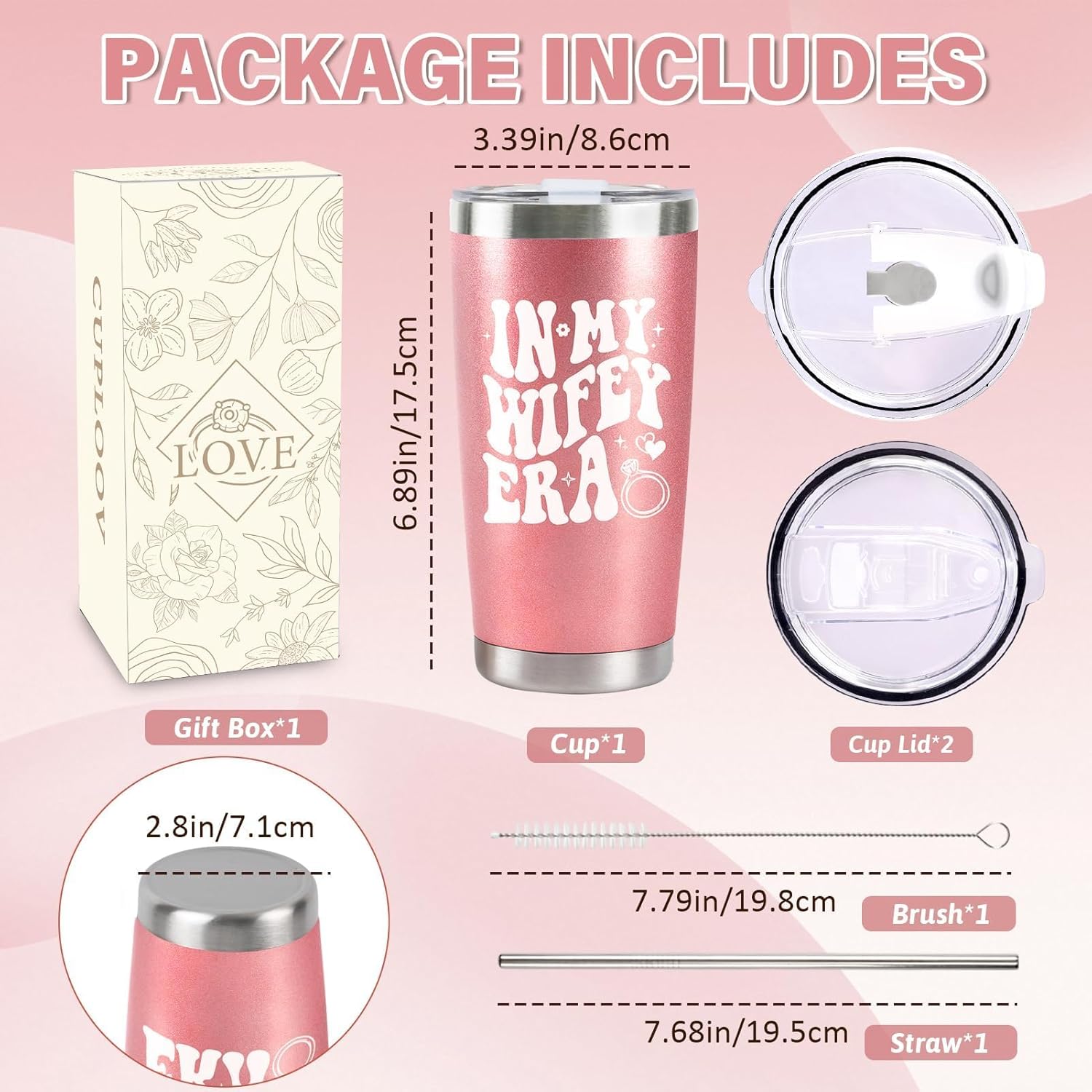 - Complete Set: This bride tumbler cup comes with a sliding lid and a straw lid. Both designed to prevent leaks and spills, making it convenient for both indoor and outdoor use. It also includes a straw and a cleaning brush, all packaged in a beautifully designed gift box, making it a perfect engagement gift for couples that’s ready to give right out of the box