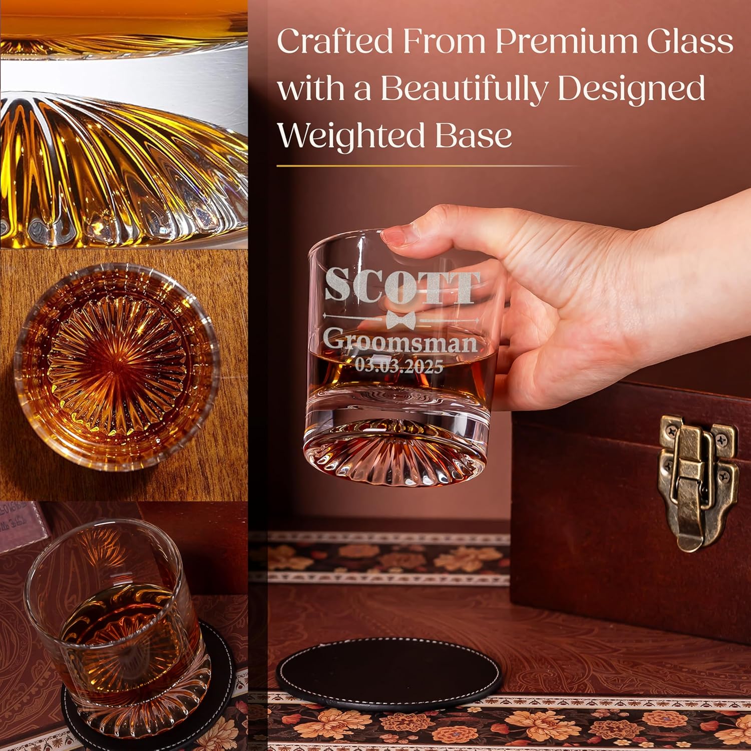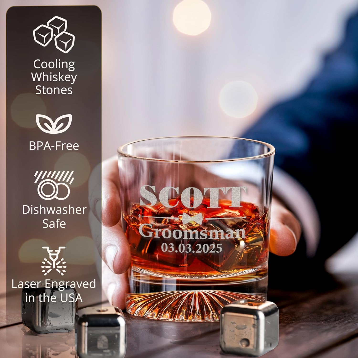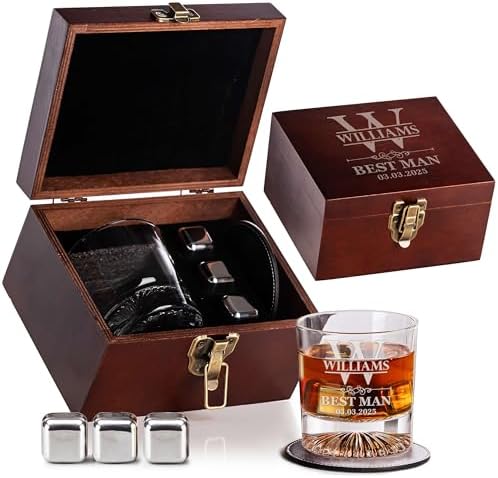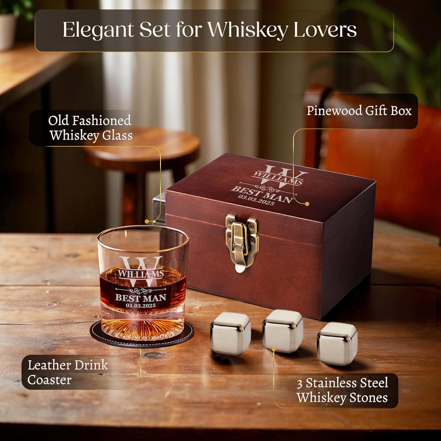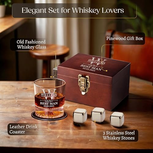 - 🥃 Complete Whiskey Gift Set for Men – Includes a custom-engraved whiskey glass, leather coaster, and stainless steel whiskey stones for the perfect celebratory drink.