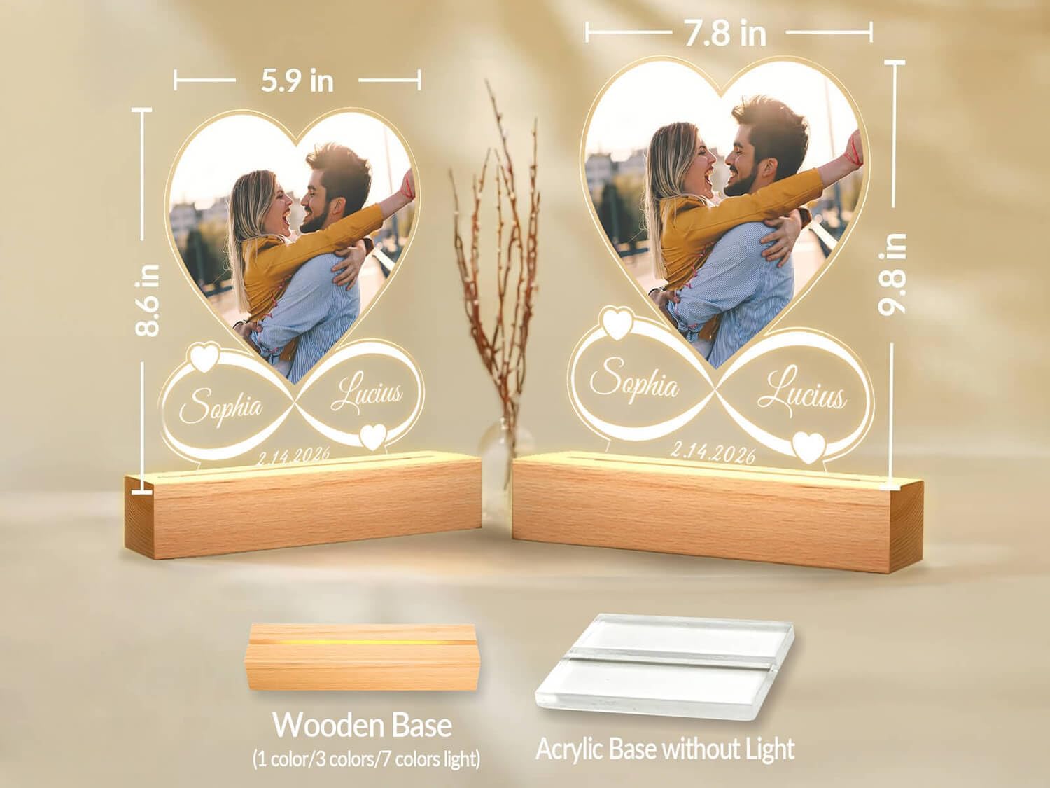 • Offer A Variety of Choices: Personalized acrylic picture frame can be designed in a variety of shapes and sizes, giving you the flexibility to choose how photos are displayed. You can choose between independent acrylic blocks, three colored small nightlight wooden shelves and seven colored small nightlight wooden shelves to meet your needs.