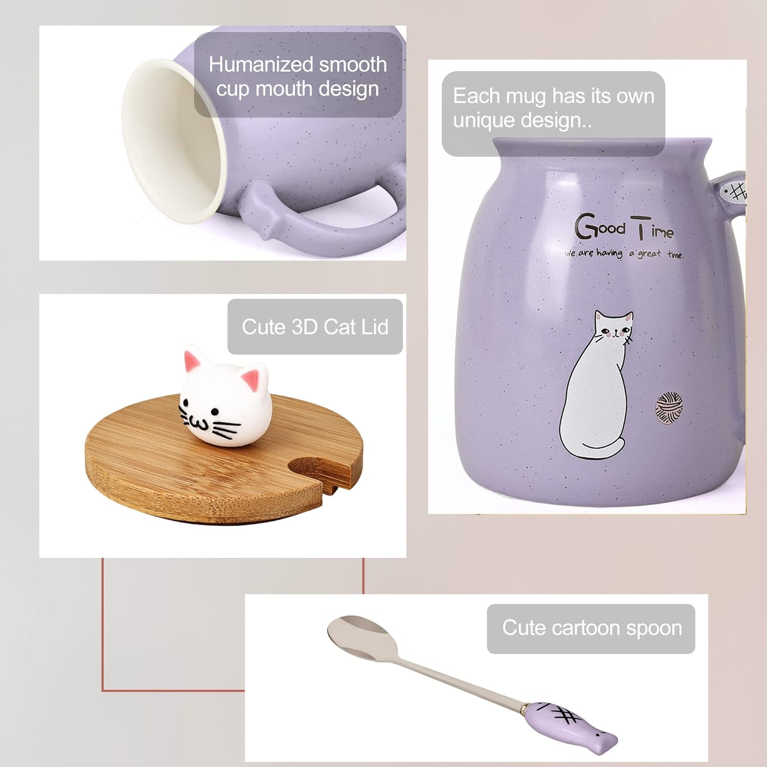 • 🐾HIGH QUALITY– Our cute cat mug set is made of high-quality ceramics, healthy material, and contains a lovely bamboo lid and a stainless steel spoon. This cute cat ceramic mug has excellent heat insulation properties and can keep your coffee or tea warm or cool.