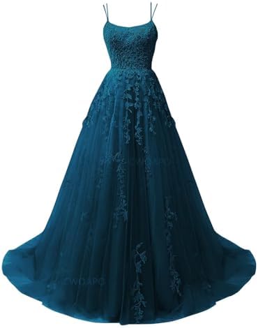 • CWOAPO Feature:Built in bra,Peacock Girls Prom Dresses Lace Appliques Tulle Spaghetti Straps Long Prom Dresses for Teens Scoop Neck A Line Ball Gown Wedding Dresses with Train,Backless A Line Peacock Wedding Dress.