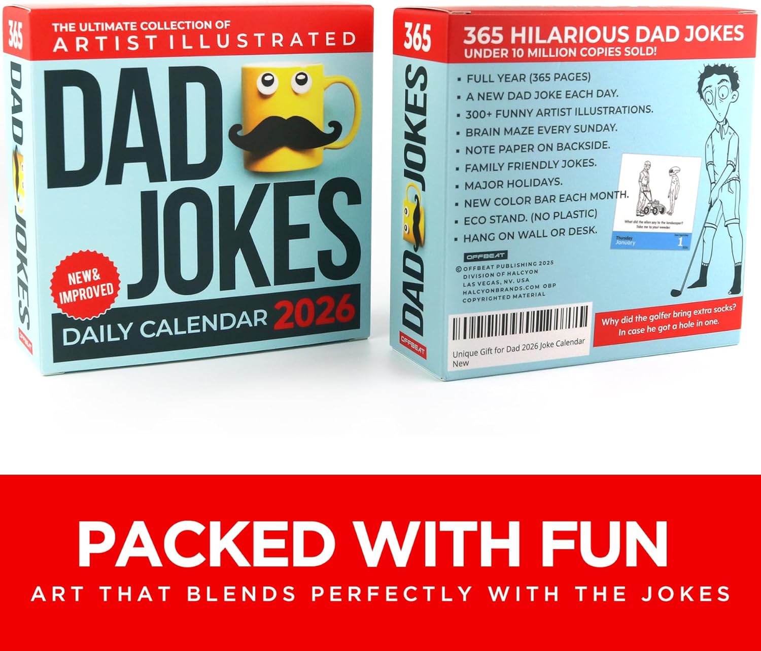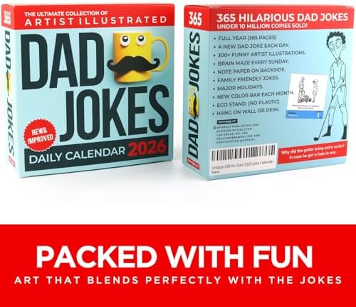 365 Days of Hilarious Dad Jokes with Artist Illustrations, Maze Puzzles and Note Pad on the back side. Every month changes to a new color band to keep it fresh and the illustrations are too funny. Features include: – Full 365 page daily tear off calendar, Weekends too. – A new Dad joke everyday day for a year. – 300 funny artist illustrations. – 53 brain mazes. – Notepad on backside. – Family Friendly Jokes (For all ages) – Major holidays. – New color for each month. (Keeps it fresh) – Eco board backing stand (no plastic). – Hang on wall or sits on desk. – 2026 Calendar measures 4.5 in. x 4.5 in. – Designed in California USA. Truly the perfect gift for the dad that has everything. The gift of laughter. Unique gift for Dads, Grandpas, Uncles, Brothers, Grandson. It not just for dad, Dad jokes are for everyone! Secret Santa, white elephant approved gift. Best gifts of 2025. Thank you.