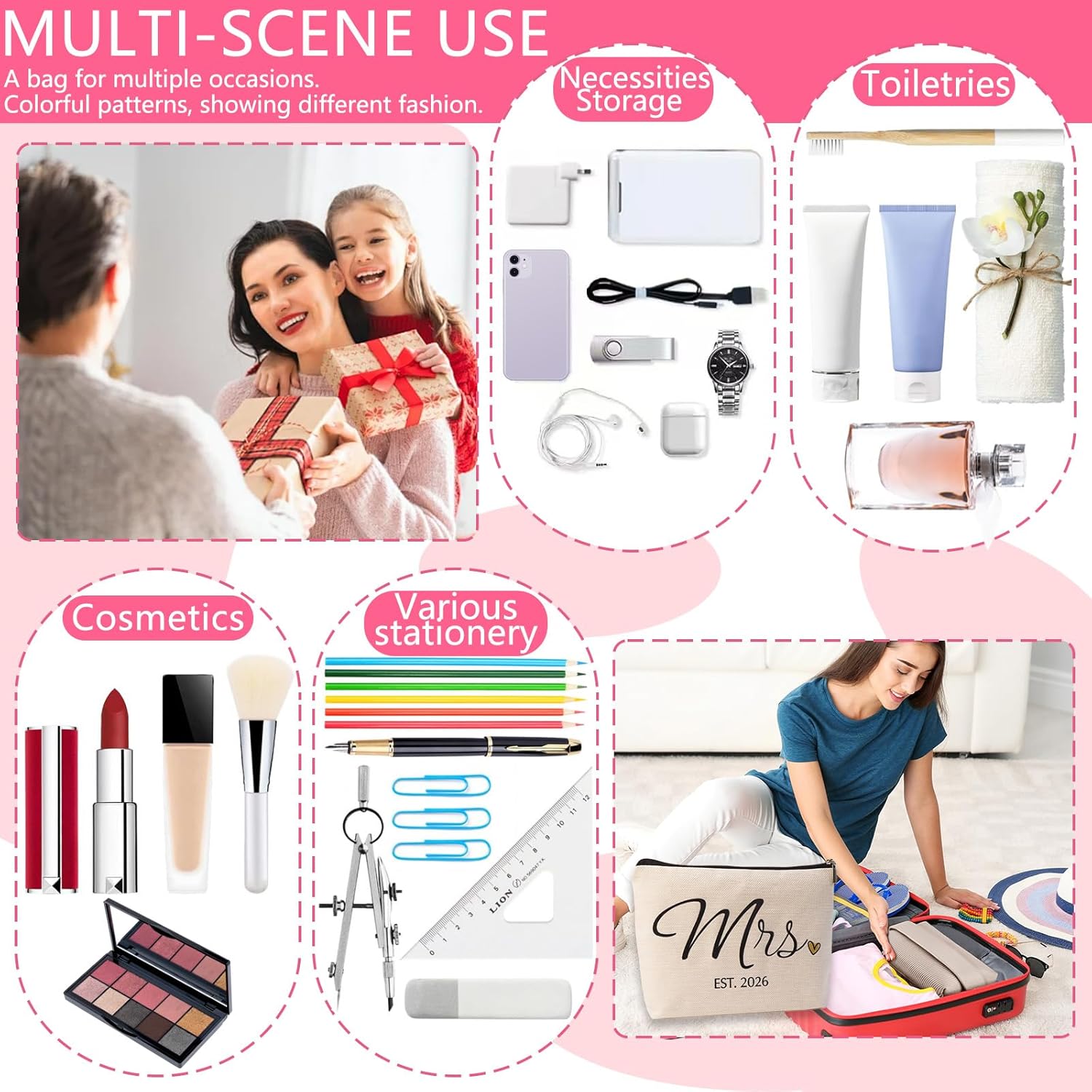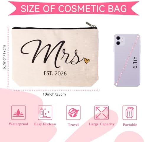 Celebrate the bride to be with the DJOLY Future Mrs bachelorette gift bags the ultimate bridal shower gift, bachelorette party accessory, and wedding essentials for bride 2026! Crafted from durable, lightweight polyester with a sleek zipper closure, this charming bridal bag features romantic Mrs designs perfect for bridesmaid gift bags, engagement gift bag, engagement gift ideas, bride gifts for bachelorette party, wedding party gifts, mrs gifts, or just married gifts. Use it as a wedding day survival kit for lipstick and touch ups, travel cosmetic bags for honeymoon adventures, or funny bridal shower gifts filled with goodies. Its compact size fits seamlessly into wedding welcome bags, bridal shower decor, or bachelorette party bags. Ideal for Mrs and Mrs wedding gifts for bride, bridesmaids gifts for wedding day, or thoughtful bride to be surprises, this versatile pouch doubles as bridal accessories for the bride or a keepsake mrs bag. From engagement party to post wedding brunches, its a must have bridal gift that says congratulations in style!