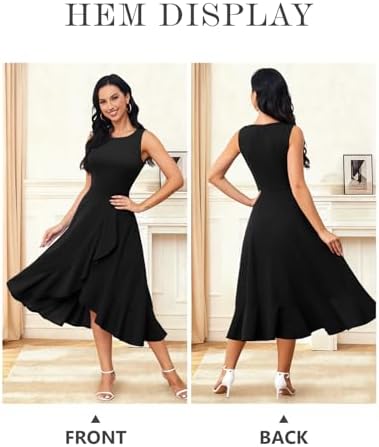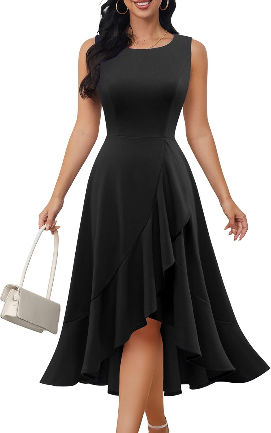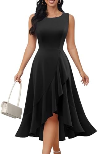 - Women’s Cocktail Dresses: Modest holiday party dresses for women feature sleeveless and mid calf. Asymmetrical ruffle high low hemline modifies figure and bring a swing look with your walking. Simple design but all extra details, Elegant but yet classy
