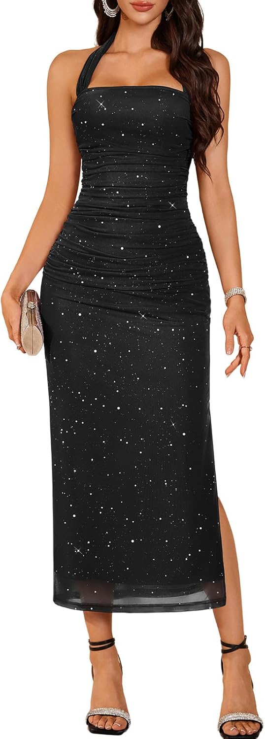 DRESSTELLS Womens Halter Sparkly Formal Maxi Dress Corset Ruched Bodycon Wedding Guest Holiday Dresses 2025