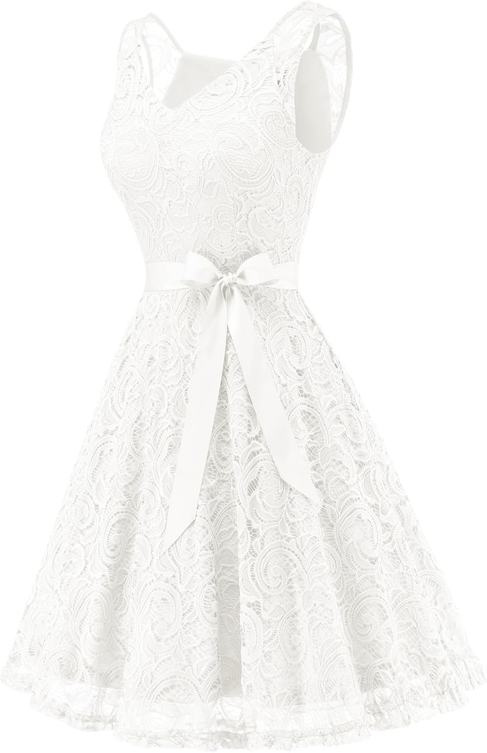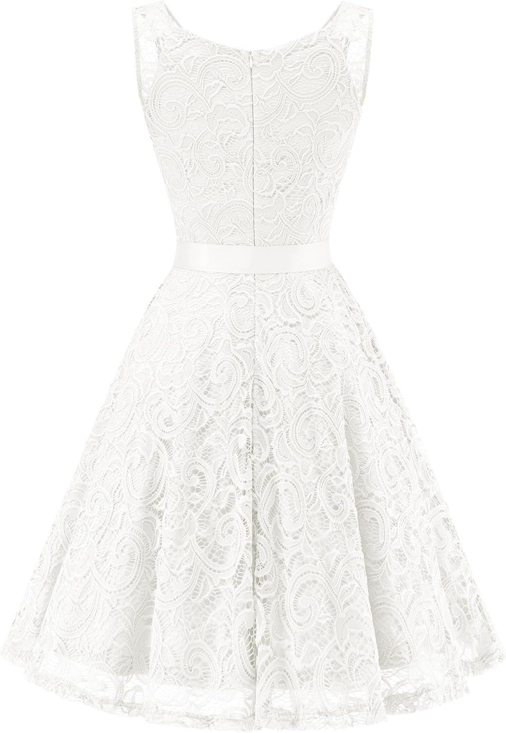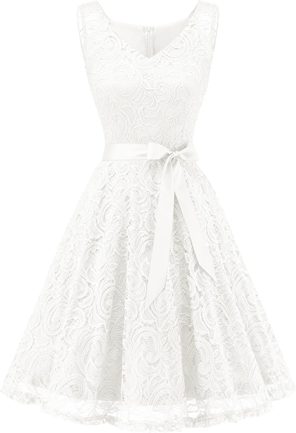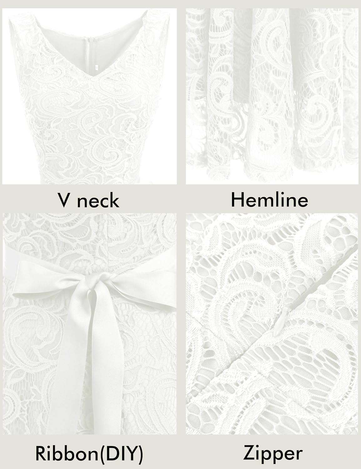 - V neck, knee length, sleeveless, delicate floral lace with detachable waistband, zip back closure. Big swing and fit flare design of the cocktail dress highlight your body curves.