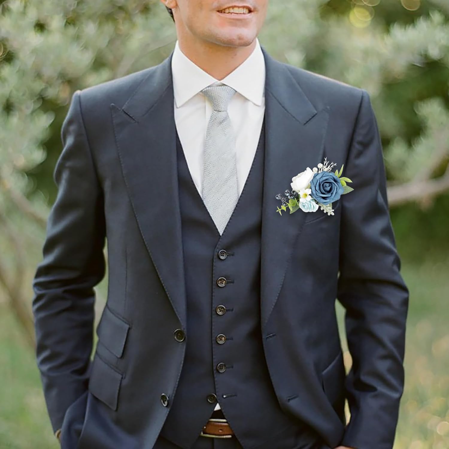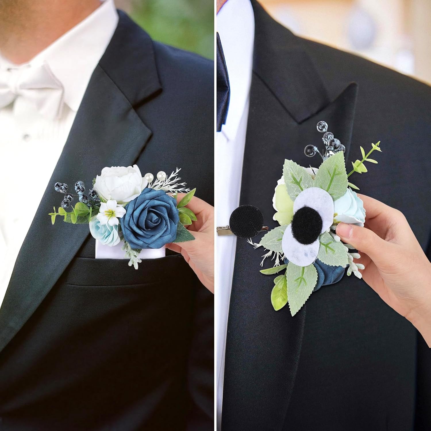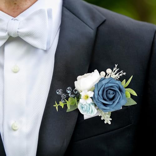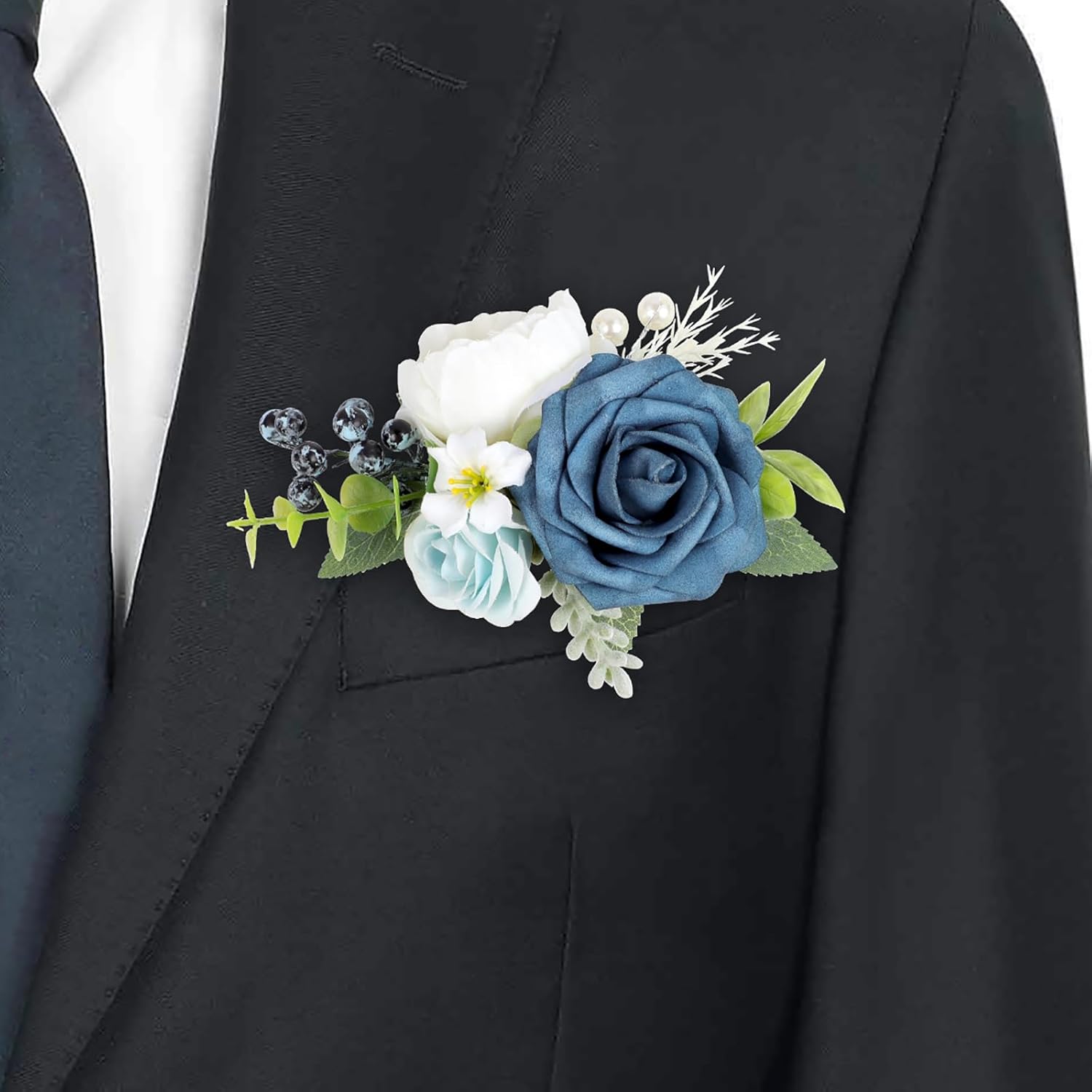 - 【Blue Boutonniere】: Roahosy pocket boutonniere is made from real-looking artificial navy blue rose, white peony, light blue flowers, enhanced by greenery, blueberries and fake pearls, creates a lifelike appearance that exudes sophistication. Each pocket boutonniere is meticulously handcrafted with attention to detail, they are ideal finishing touch for any occasion
