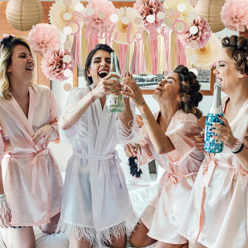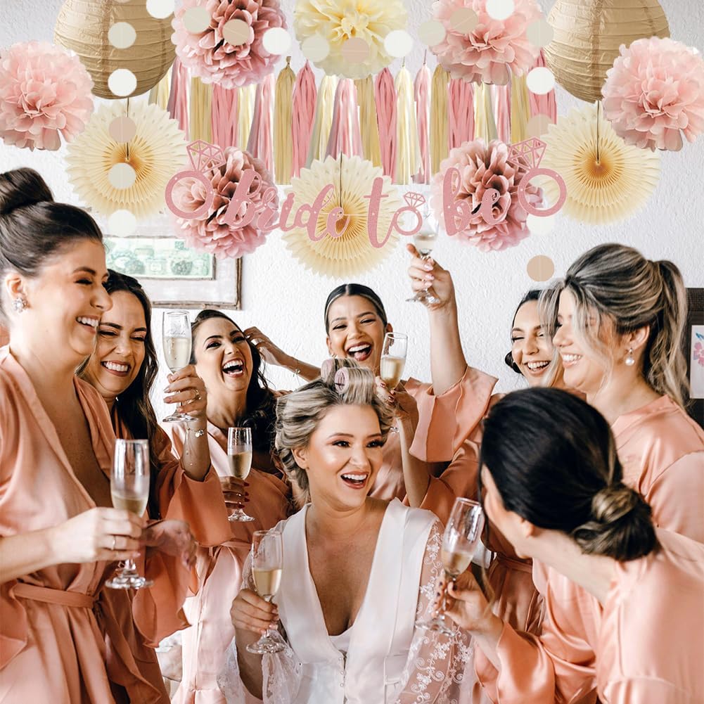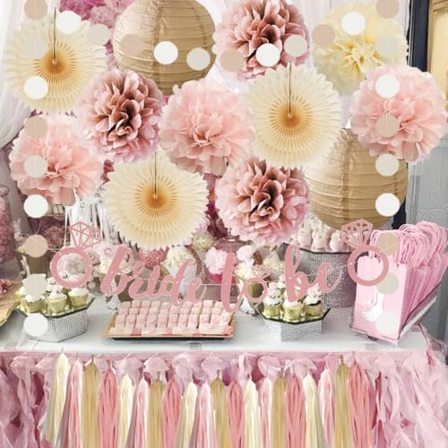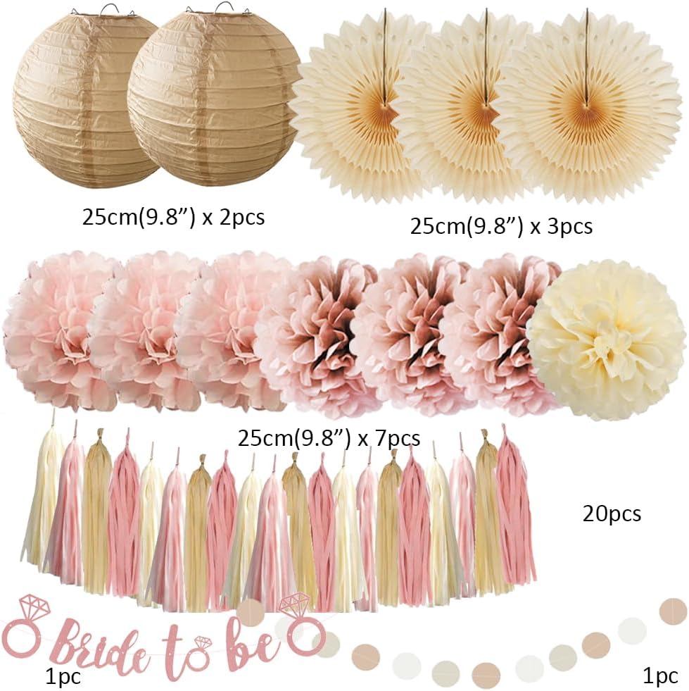 - 【Boho Pink Bridal Shower Decorations Kit】 3pcs beige paper fans decorations, 7pcs dusty rose, blush pink and cream tissue paper pom poms, 2pcs champagne gold paper lanterns, 1pc bride to be banner rose gold, 1pc paper garland circle dots, 20pcs dusty pink beige tassel garlands