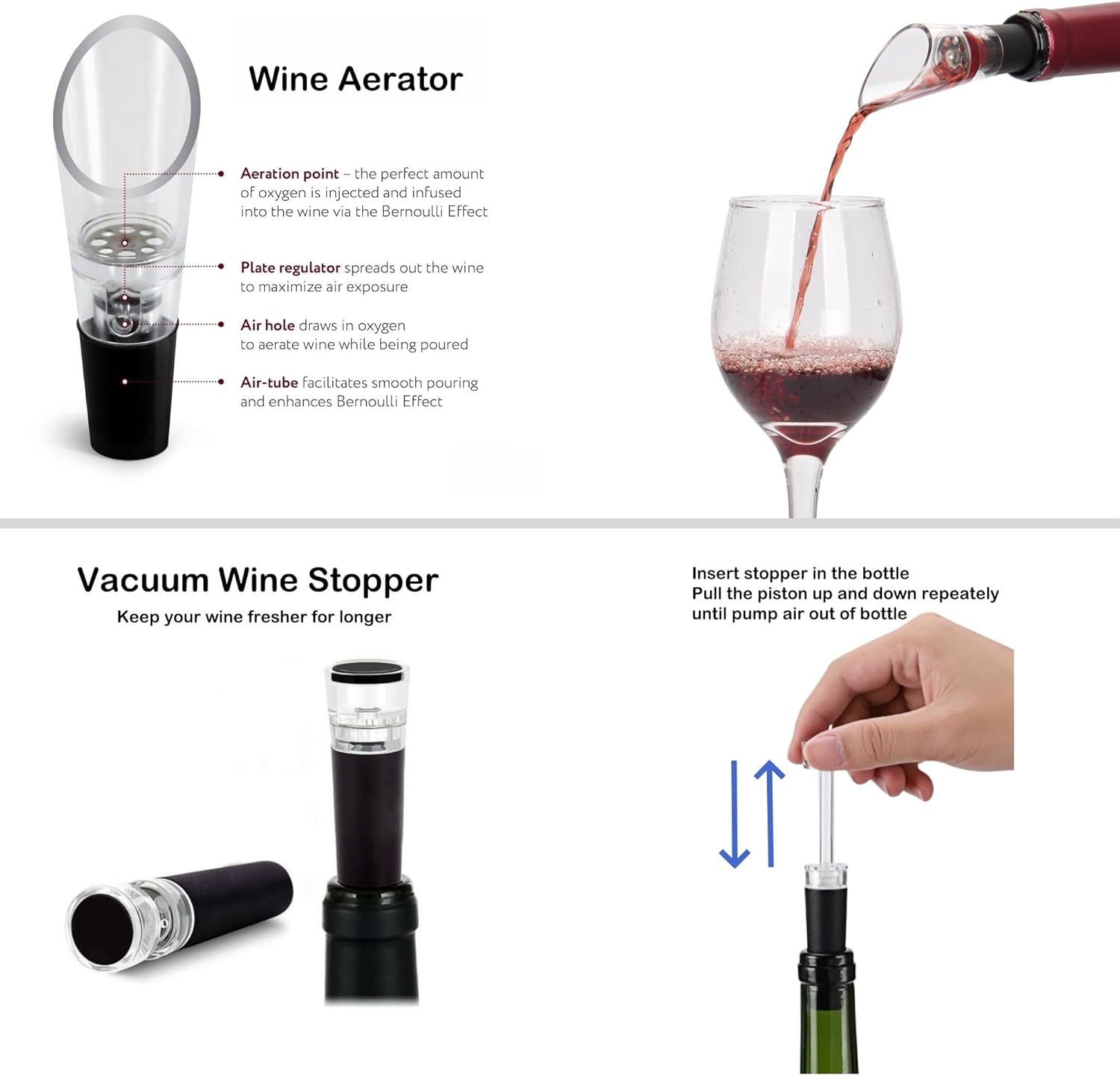 - 𝐄𝐧𝐡𝐚𝐧𝐜𝐞𝐝 𝐖𝐢𝐧𝐞 𝐓𝐚𝐬𝐭𝐢𝐧𝐠 𝐄𝐱𝐩𝐞𝐫𝐢𝐞𝐧𝐜𝐞: The set includes a premium wine aerator that infuses oxygen into your wine as you pour, enhancing the flavors and aromas. This process replicates hours of traditional decanting, allowing you to enjoy a well-aerated glass of wine instantly, making each sip more enjoyable.