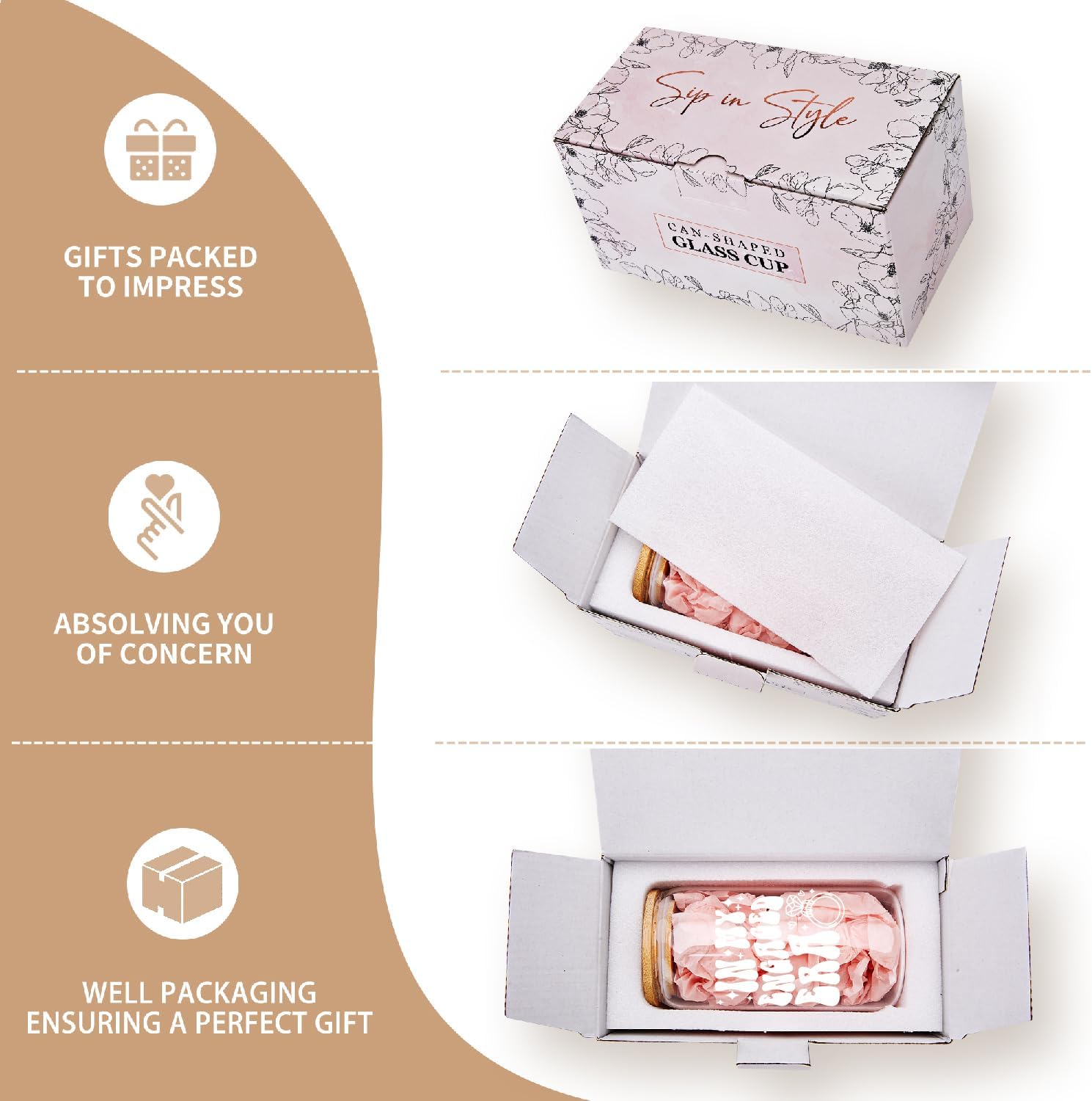 - ELEGANT AND SECURE PACKAGING – The glass tumbler arrives with pink tissue paper inside, adding a charming touch when unwrapped. An attractive gift box makes it ready for gifting, and sturdy packaging ensures the tumbler remains intact for a delightful presentation.