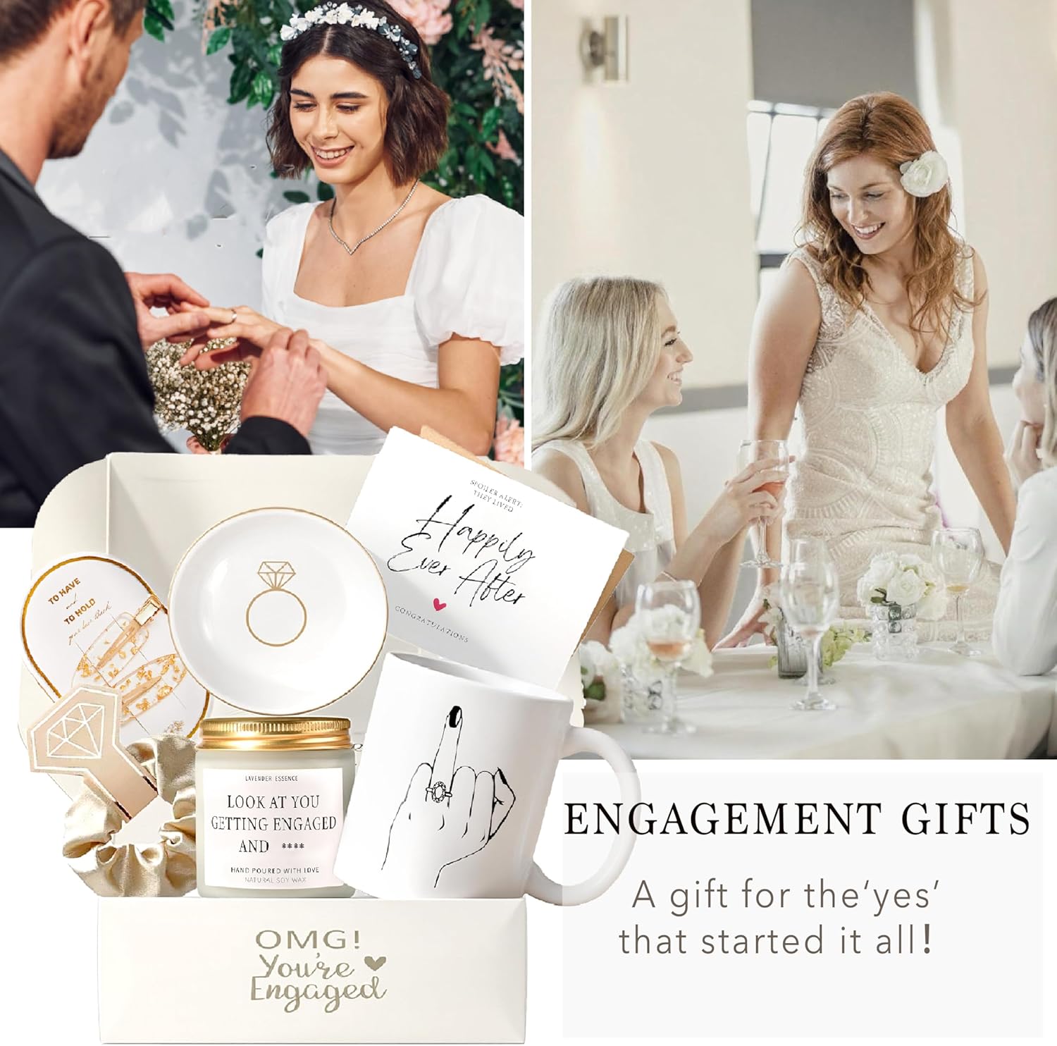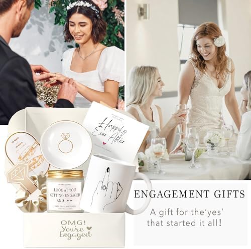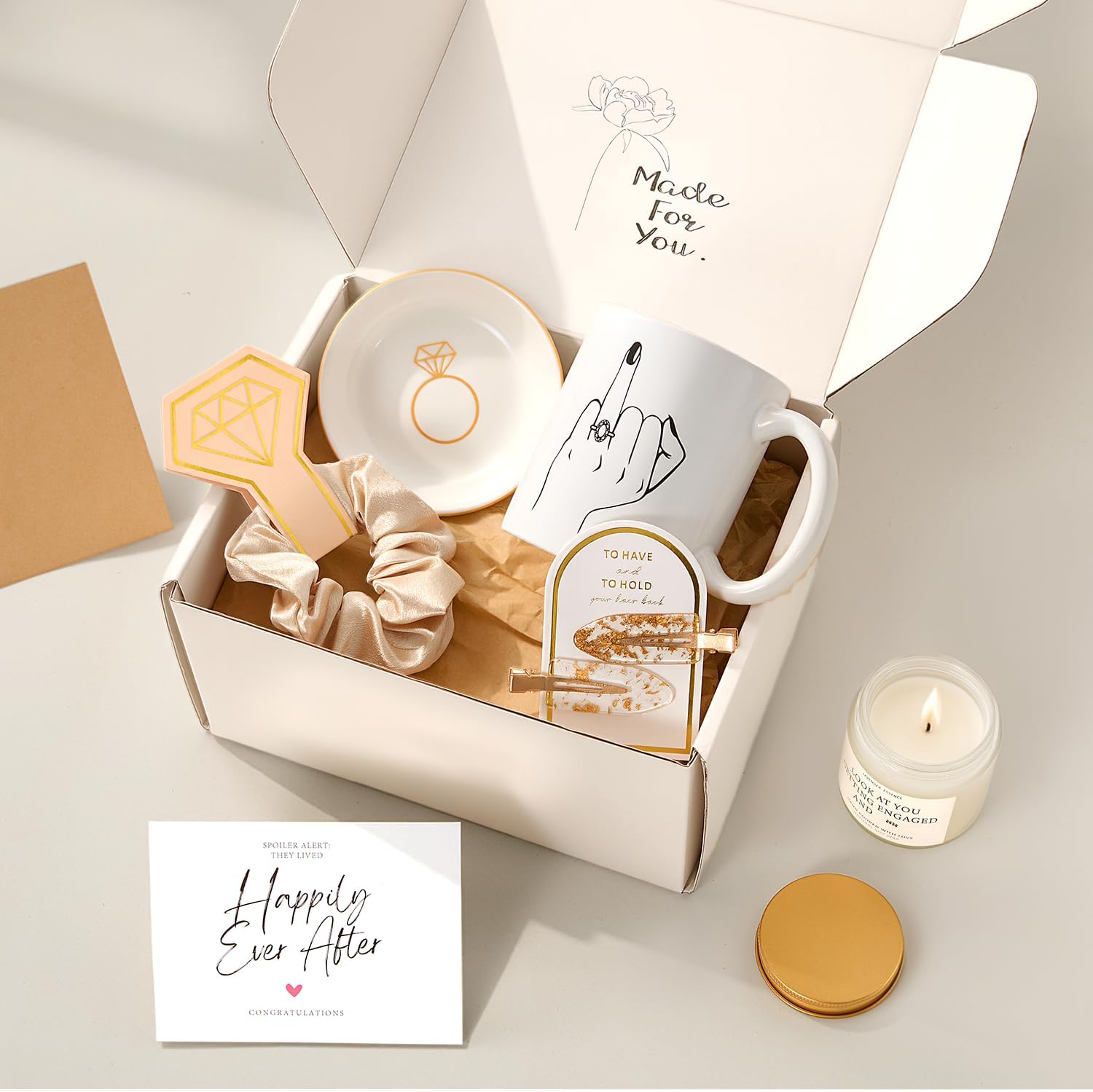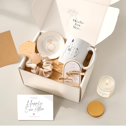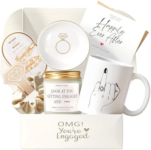 - PERFECT ENGAGEMENT GIFT SET FOR COUPLES: Celebrate love with this elegant engagement gift box, featuring a ceramic coffee mug, jewelry dish, scented candle, hair clips, hair ties, and a heartfelt greeting card. Ideal for proposals, weddings, anniversaries, or bridal showers, this curated set creates a romantic and memorable unboxing experience. A thoughtful present for your fiancee, spouse, or newly engaged couples to cherish the special moment.