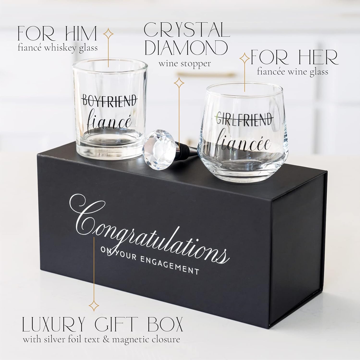 - WHAT’S INCLUDED IN THIS FIANCE GIFTS FOR COUPLE? This his and hers glass set includes (1) 9.5oz Whiskey Glass, (1) Crystal Diamond Wine Stopper, and (1) 12oz Stemless Wine Glass for hours of easy wedding planning. It’s all packaged securely in our luxury congratulations gift box—an all-in-one engagement gift for couples.