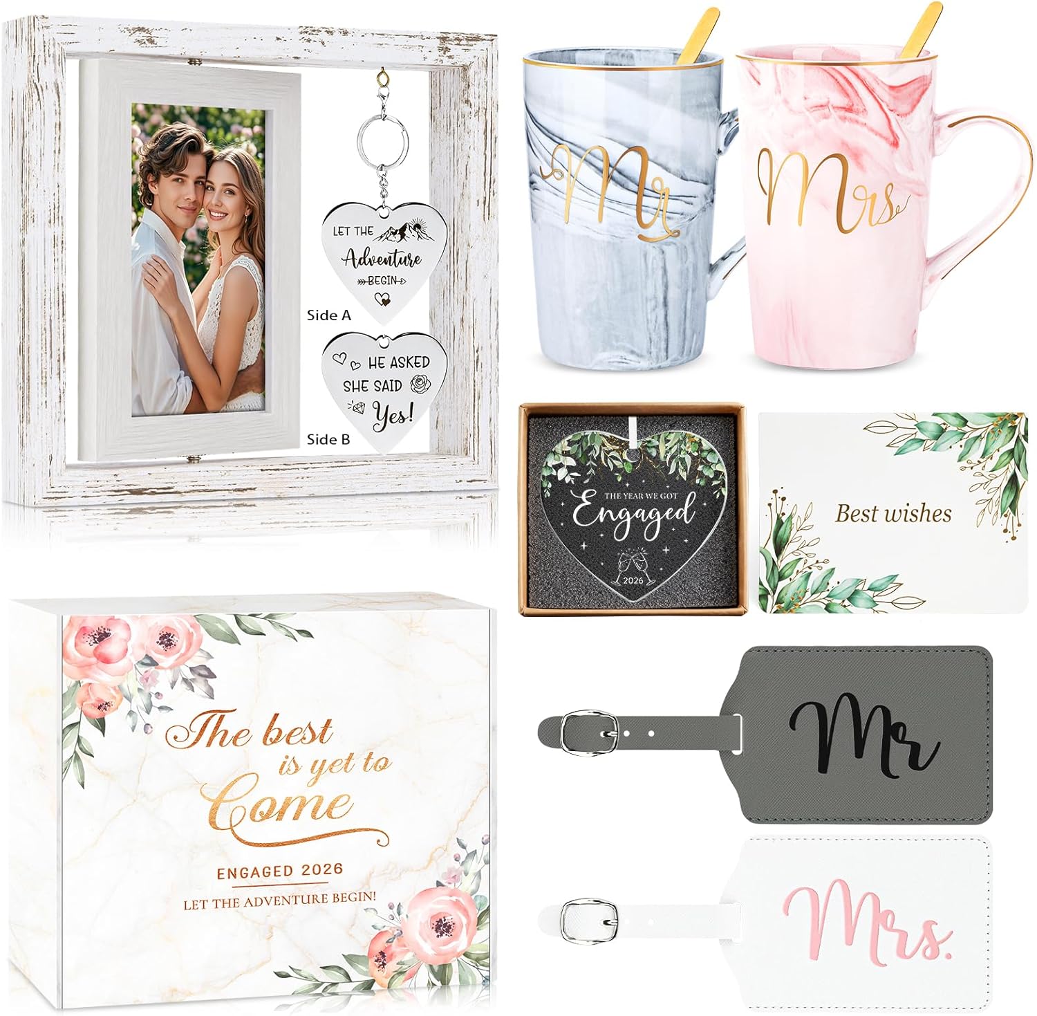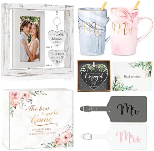 - Engagement Unique Gifts: Our meticulously prepared couple’s gift set is designed to captivate every newlywed pair at first sight. The collection includes 8 items: 1 x engagement picture frame, 2 x mr & mrs coffee mugs, 2 x luggage tags, 1 x engaged ornament, 1 x handwritten greeting card, 1 x elegant gift box. Each item symbolizes a wish for their future, transforming the unboxing moment into a cherished celebration of love and the start of their new journey together.