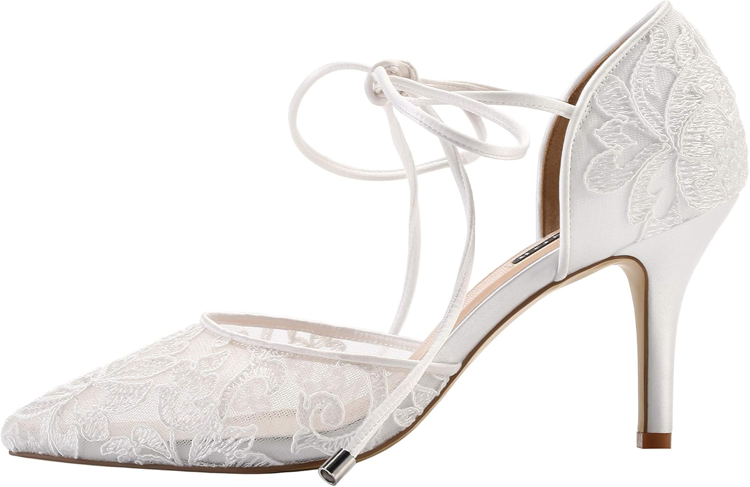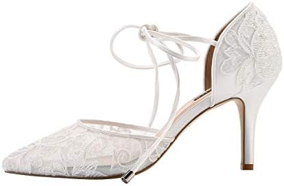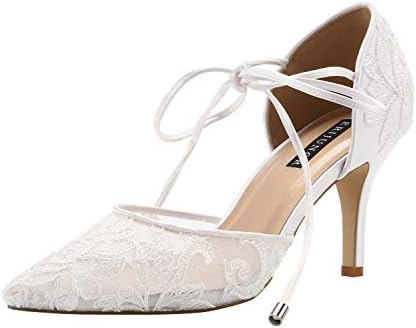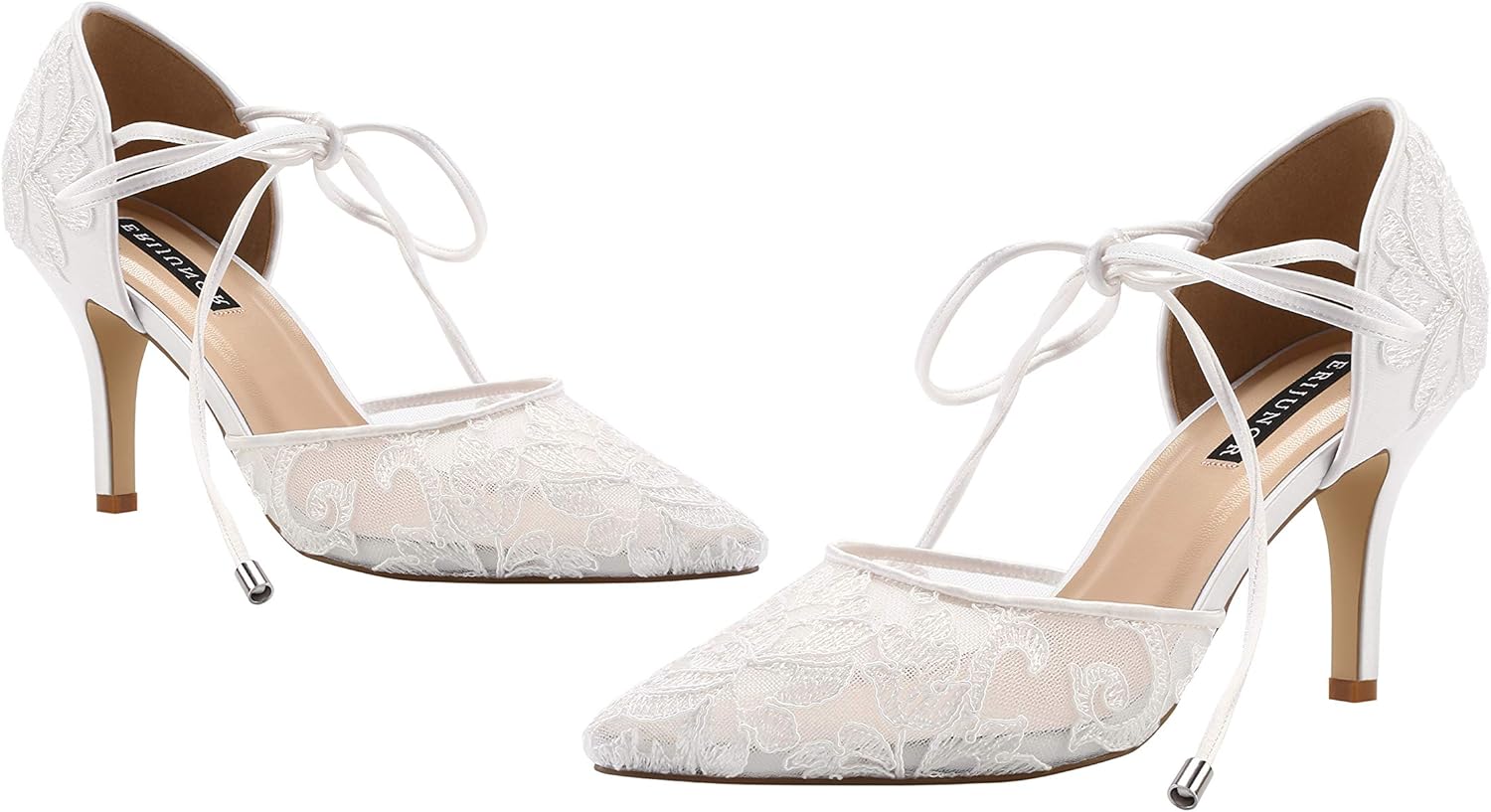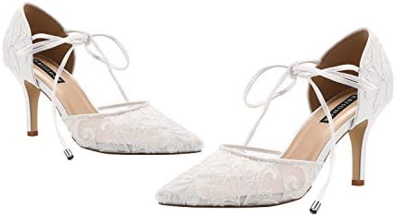 ERIJUNOR Ivory Lace Mesh Satin Bridal Wedding Shoes for Women Comfortable Mid Heel Tie Up Ankle Strap Pointy Toe Pumps