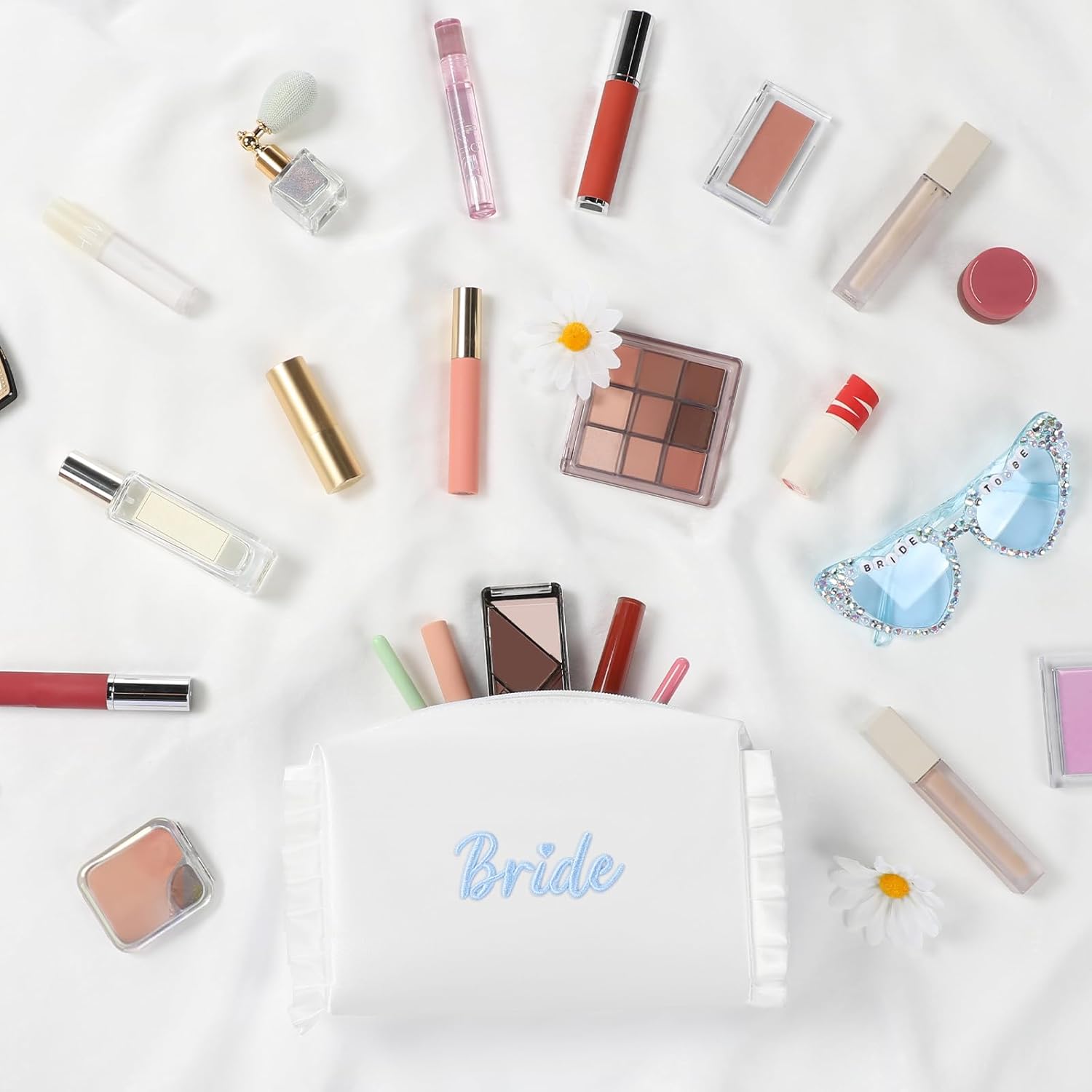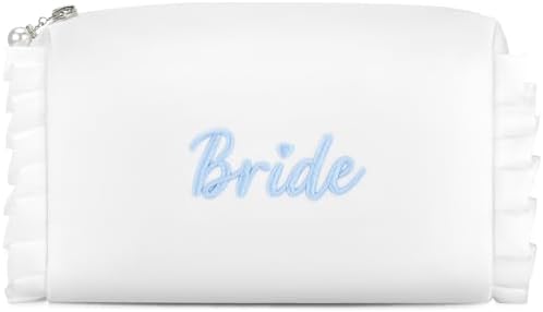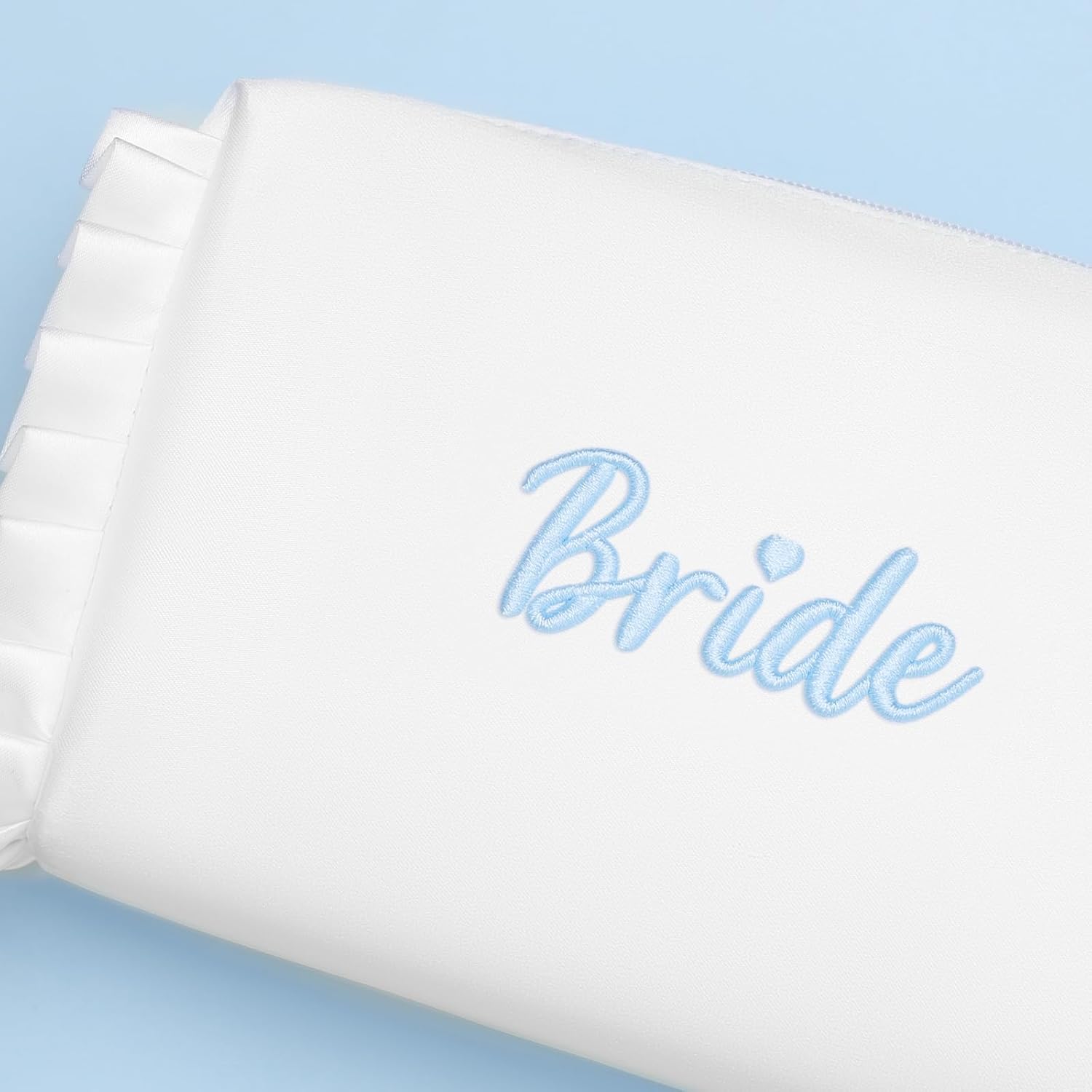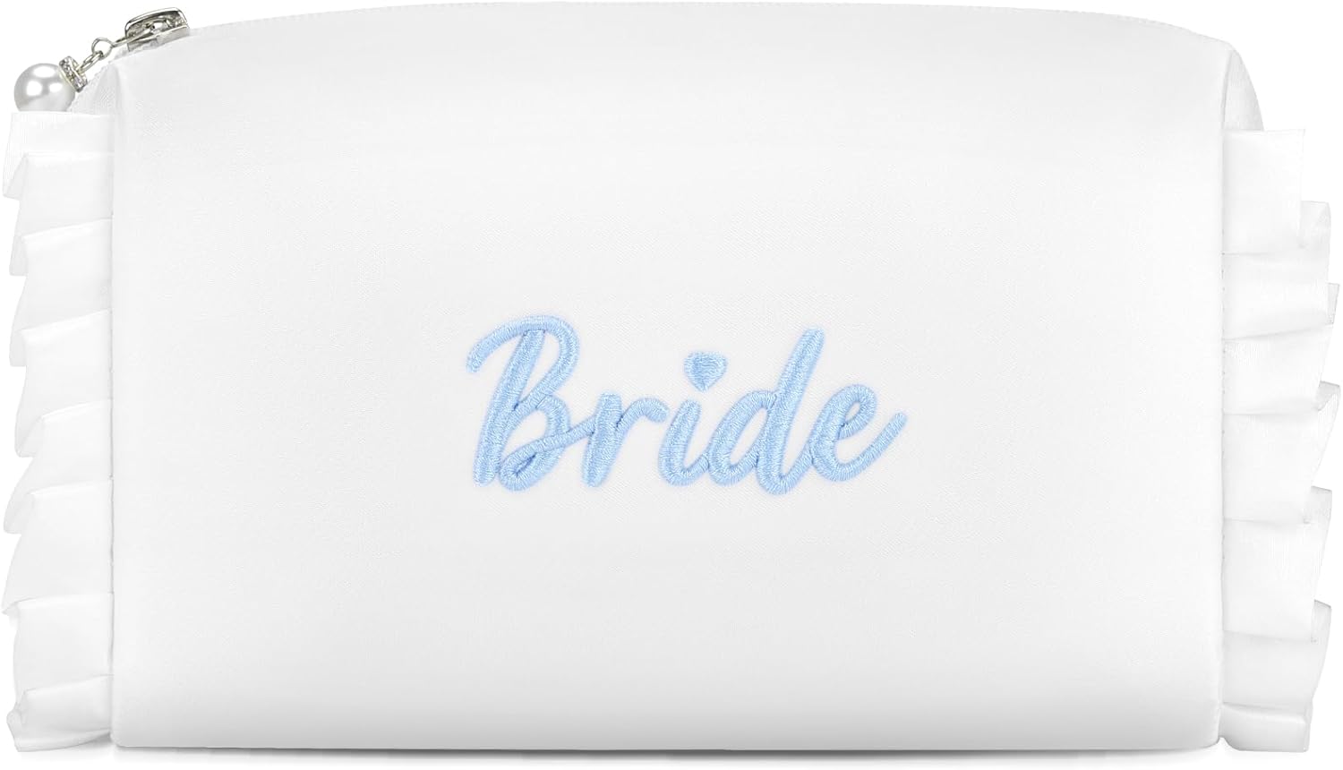 - Something Blue Gift For Bride: We hope you’re ready to become the coolest bride around with our beautiful white satin bride cosmetic bag!Featuring a blue embroidered “bride” and ruffle edges, there’s not a moment this bag isn’t ready for!Don’t miss the chic pearl zipper details