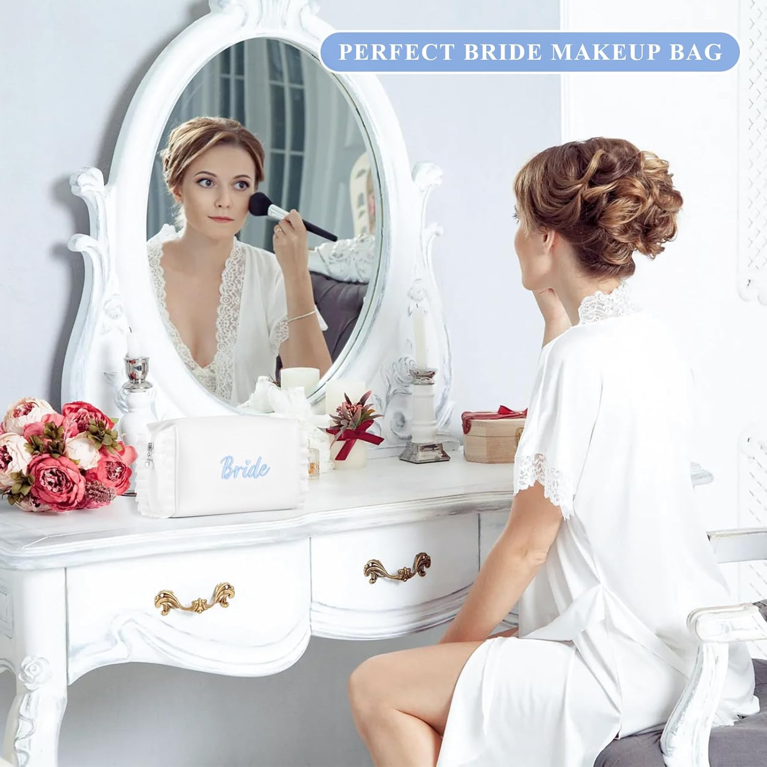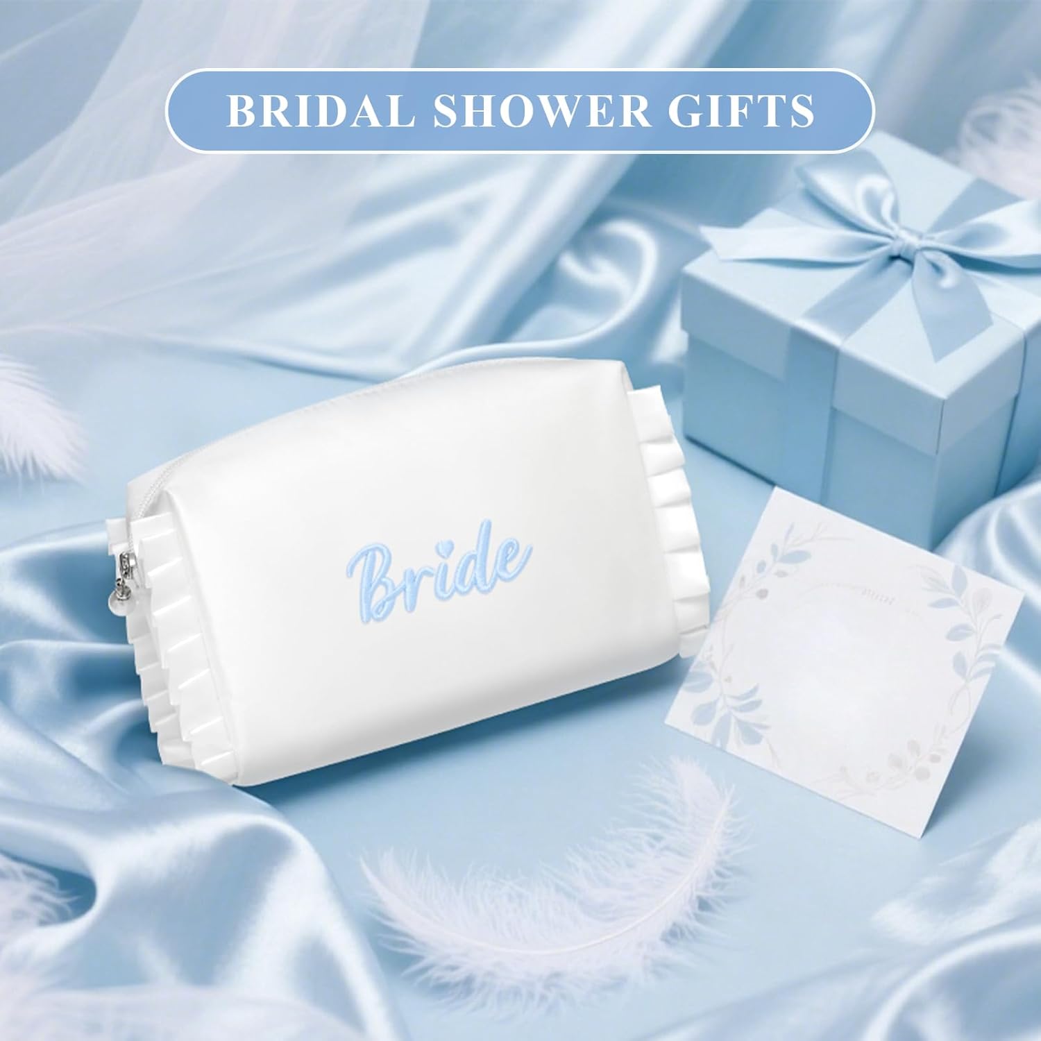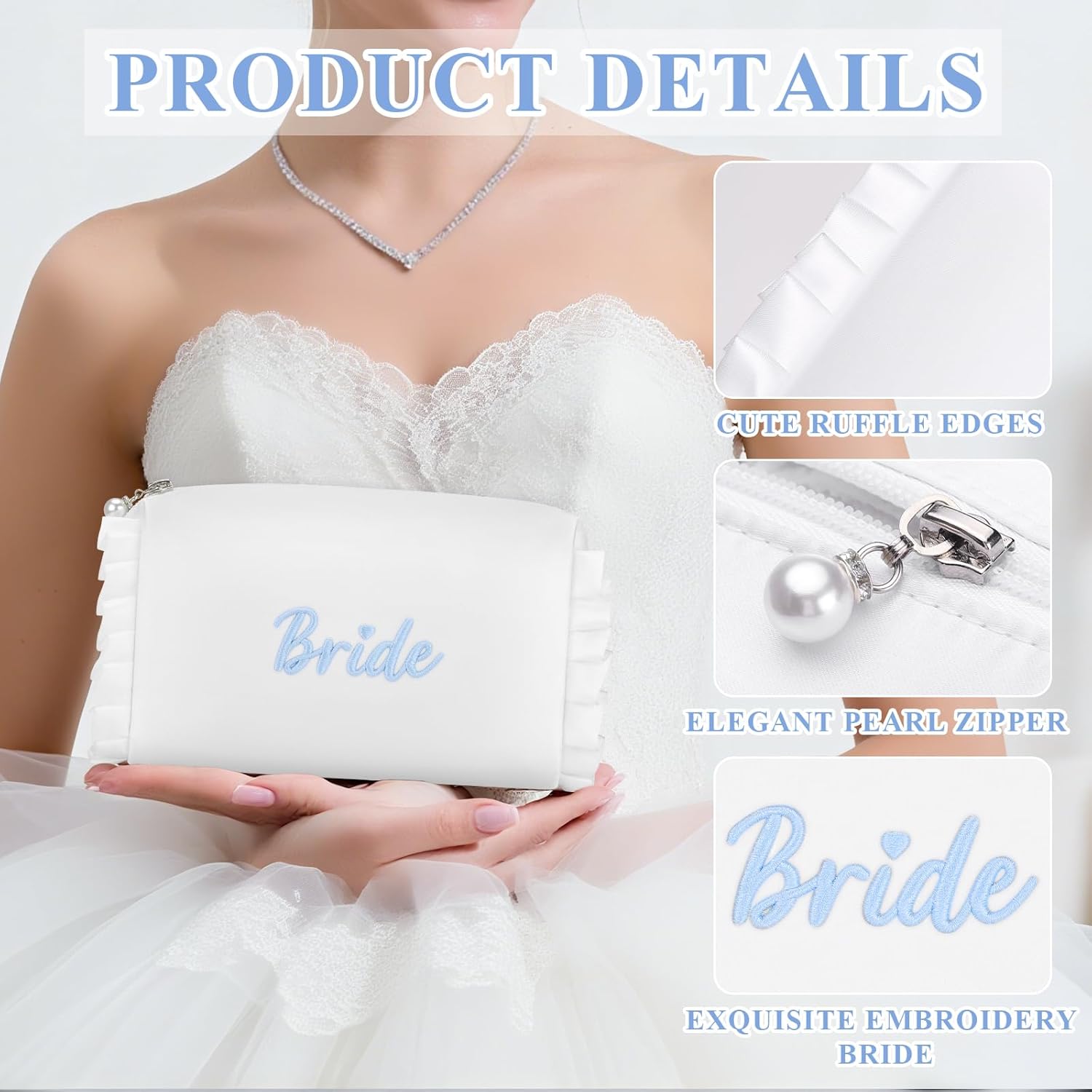 - Something Blue Gift For Bride: We hope you’re ready to become the coolest bride around with our beautiful white satin bride cosmetic bag!Featuring a blue embroidered “bride” and ruffle edges, there’s not a moment this bag isn’t ready for!Don’t miss the chic pearl zipper details