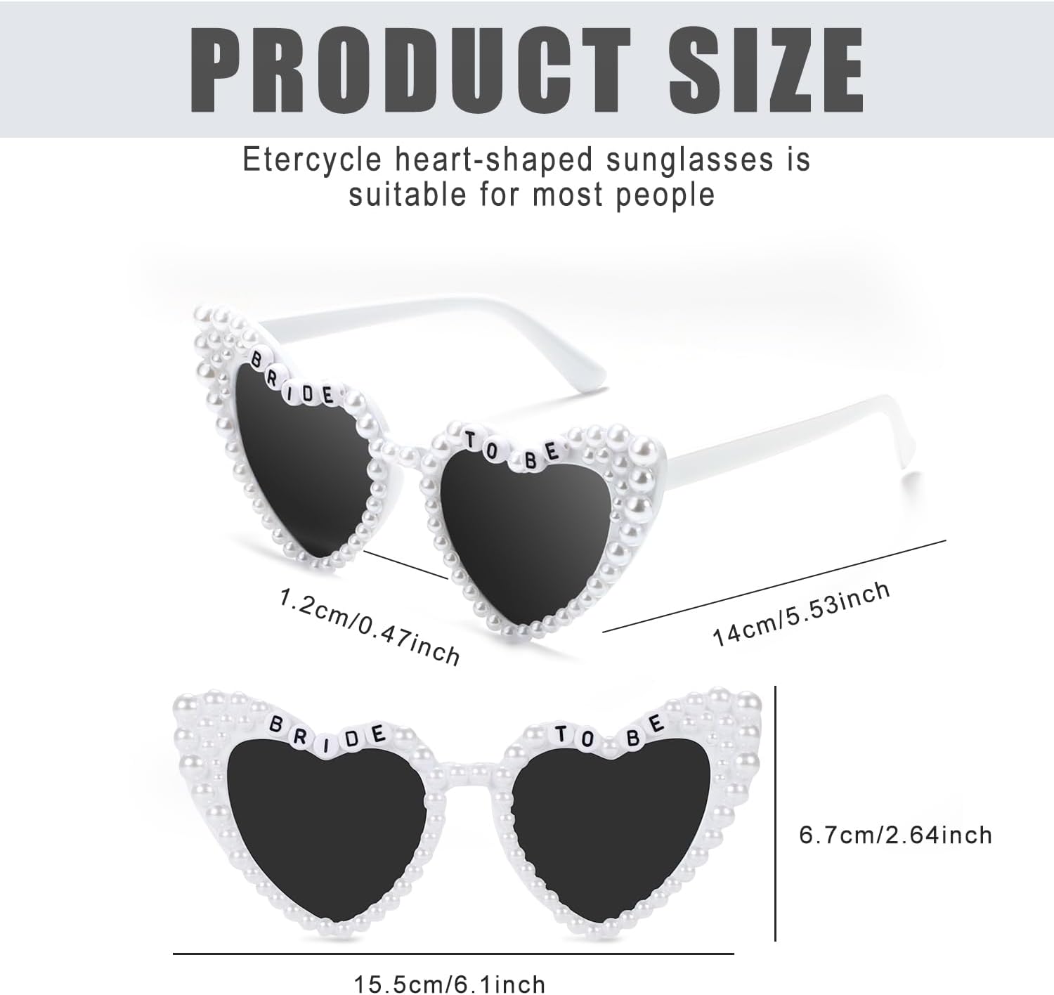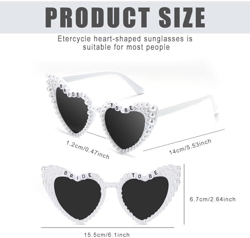 - Bride To Be Sunglasses: Etercycle’s heart sunglasses are decorated with dazzling crystals/pearl and white “BRIDE TO BE ” lettering, symbolizing timeless love and happiness.This not only a good decoration at the bachelor party but also an excellent Photo props for you to take pictures.Elegant bridal sunglasses, once put on, you will be the center of attention in bachelorette and bride to be party