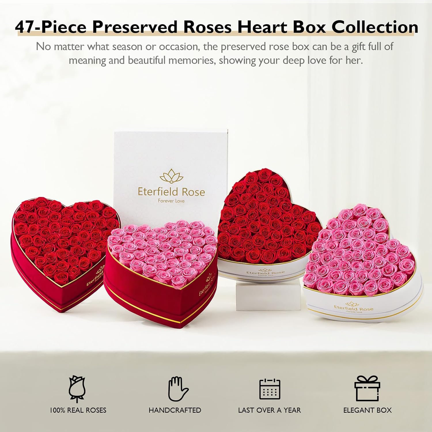- Roses that Last Over a Year: Every preserved rose undergoes a cutting-edge method which allows them maintain their beauty and color for at least a year. With Eterfield long lasting rose, we offer an elegant, luxurious way to create lasting moments with the people you cherish most. Not just once, but every day, all year.