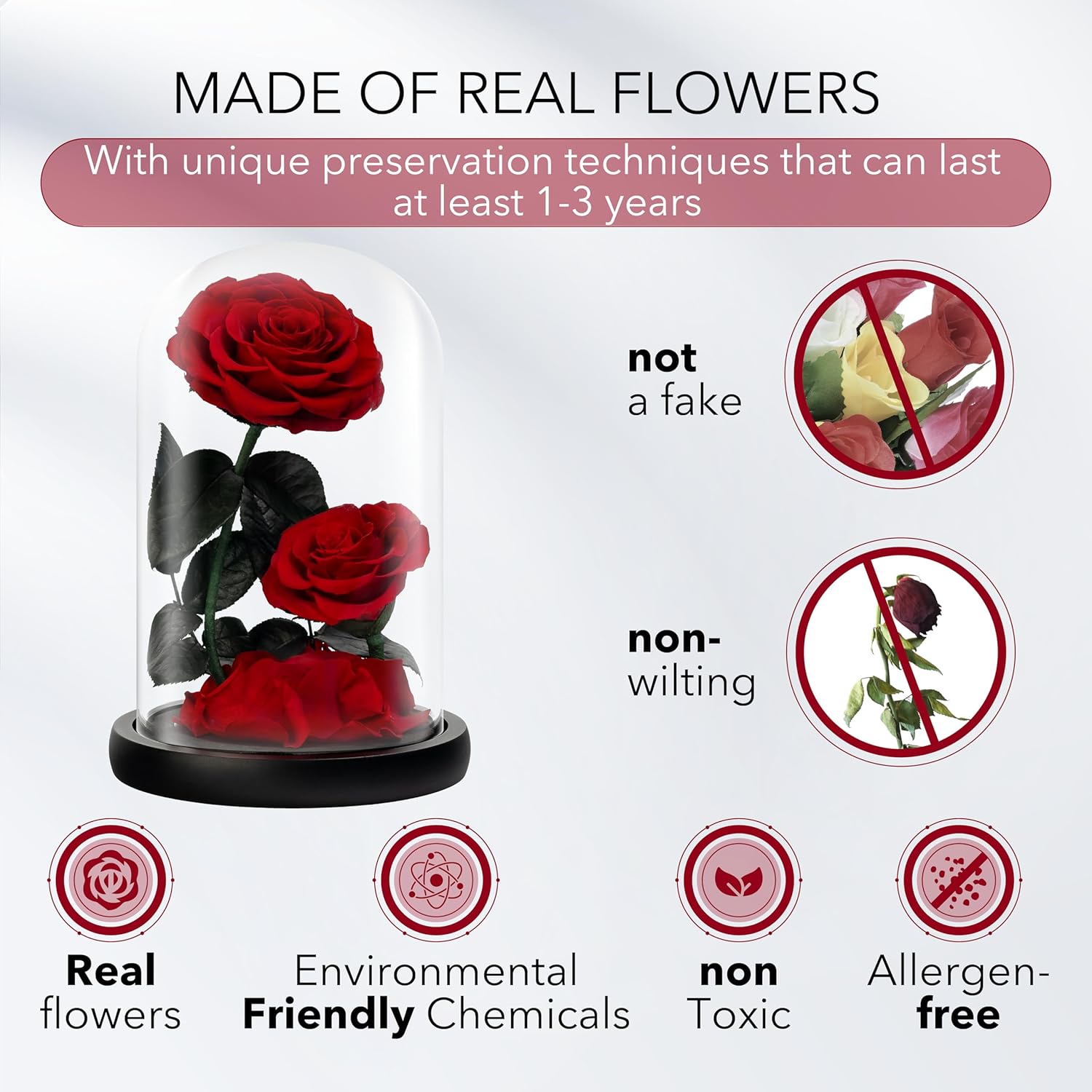 • Timeless Beauty:Our Eternal Roses, known as “Preserved Roses,” are addition to your decor, preserved in a charming glass dome.