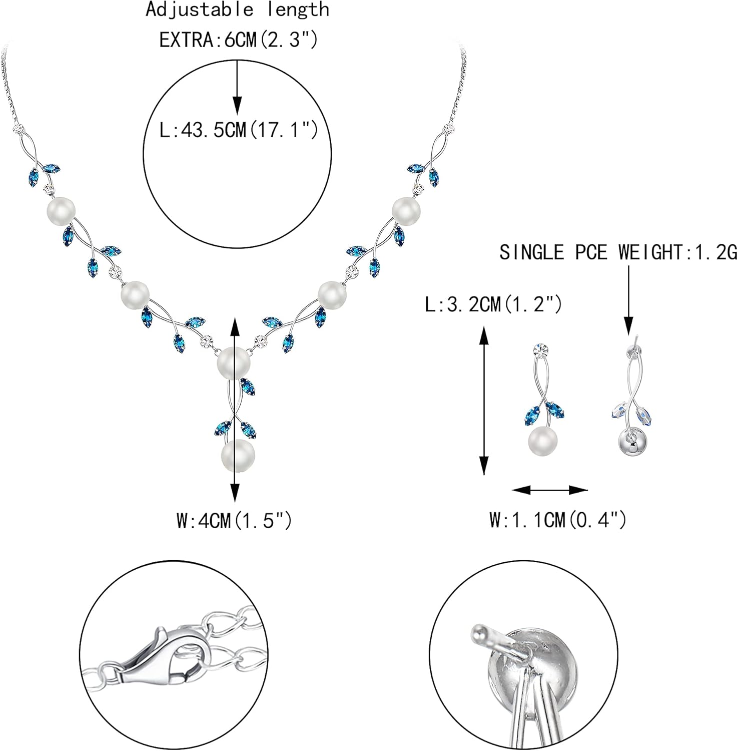 - Necklace Length: 43.5cm(17.1″)-49.5cm(19.5″), Attachment Size: 21cm(8.2″)by4cm(1.5″), Earring Size: 1.1cm(0.4″)by3.2cm(1.2″), One Earring Weight: 1.2g.