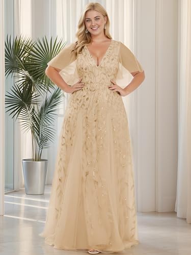 Ever-Pretty Womens Plus Size Sequin Embroidered Formal Evening Gown V-Neck Sheer Short Sleeve A-Line Mother of Biride Dress