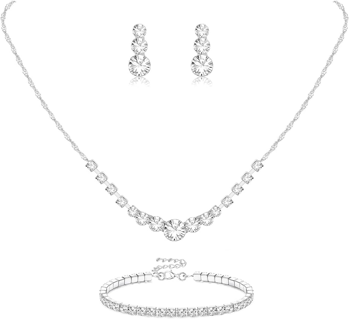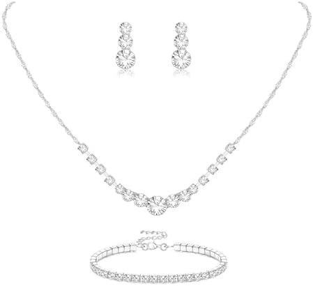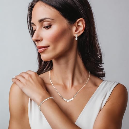Eyesoul Silver Plated Jewelry Set for Women Rhinestone Crystal Necklace Drop Earrings Link Bangle Bracelet Bridal Wedding Jewelry Sets for Brides Bridemaid Prom Costume Accessories