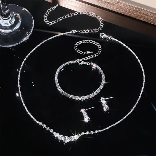 Silver Plated Jewelry Set for Women Rhinestone Crystal Necklace Drop Earrings Link Bangle Bracelet Bridal Wedding Jewelry Sets for Brides Bridemaid Prom Costume Accessories