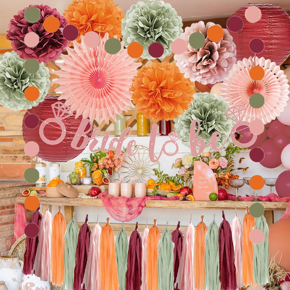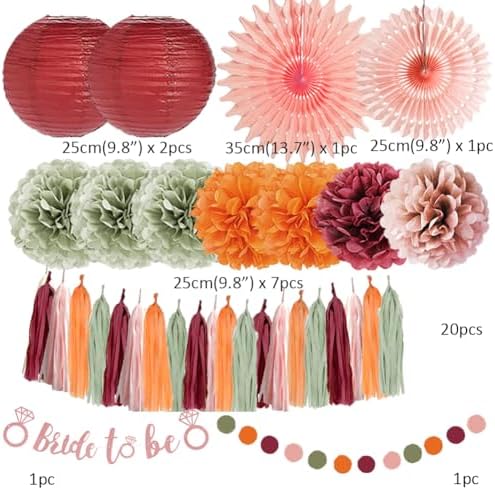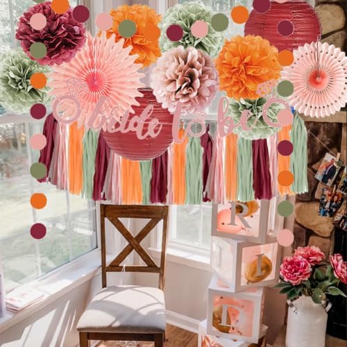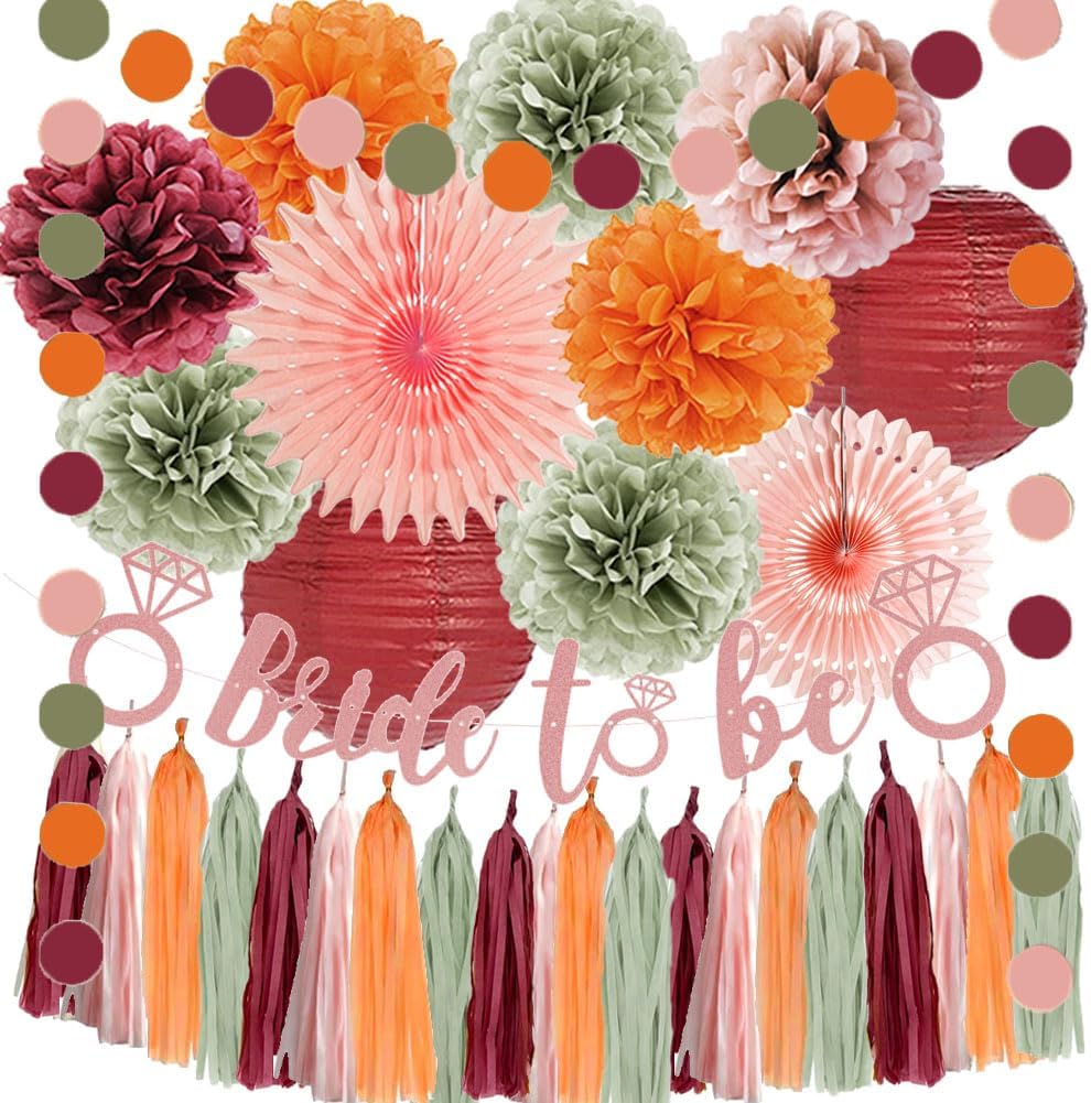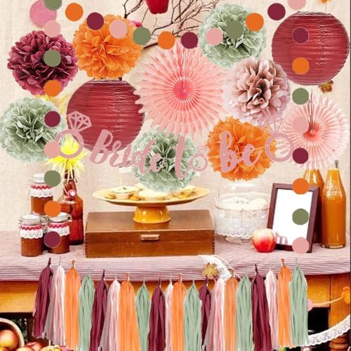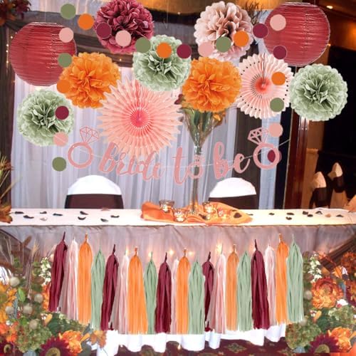 - 【Fall Bridal Shower Decorations Kit】 2pcs paper fans decorations, 7pcs dusty rose, sage green burgundy and orange tissue paper pom poms, 2pcs burgundy paper lanterns, 1pc bride to be banner rose gold, 1pc paper garland circle dots, 20pcs dusty pink sage green burgundy and orange tassel garlands