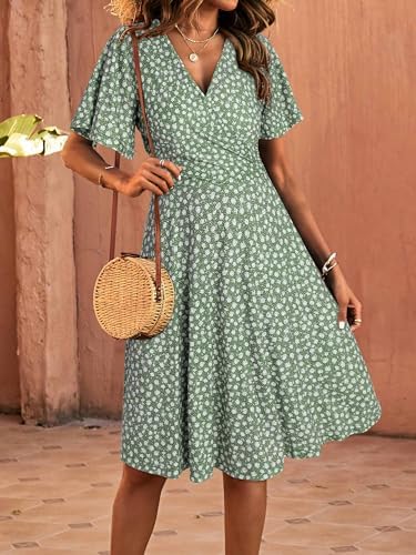 - Features: Faux wrap v neck, ruffle short sleeve, a line, empire waist, above knee length, flowy, floral print or solid color; Flowy and flattering, this summer dress sculpts a graceful silhouette while smoothing over the stomach and hips. Its simple, classy design makes it a wardrobe essential, with cute ruffle sleeves that add charm and subtly refine the arm line